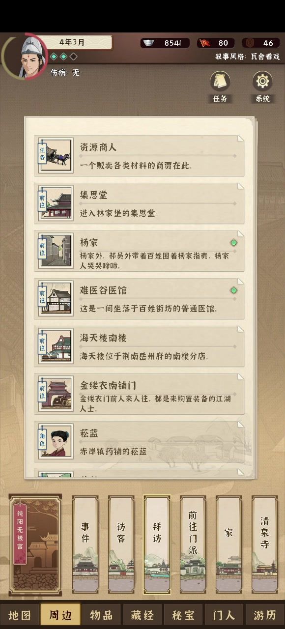 门人招募:胸口碎大石1.需要触发1年2月的地图事件《黄河三圣》,并且不能打赢(一般推荐专门弄一个档去招募,因为很难不打赢……)。2.后续地图事件《奇异的音乐》再去触发,会给一个南山乐谱,研究后解锁一个成就,然后可以拉他进门派。门人招募:李大前置事件:富贵庄的刘管事,对话后去找三个农民,李大这边打赢他就可以入队了。门人招募:何二前置事件:1.《飞沙走石》几个小混混从银鼠帮偷了一本秘籍来看;