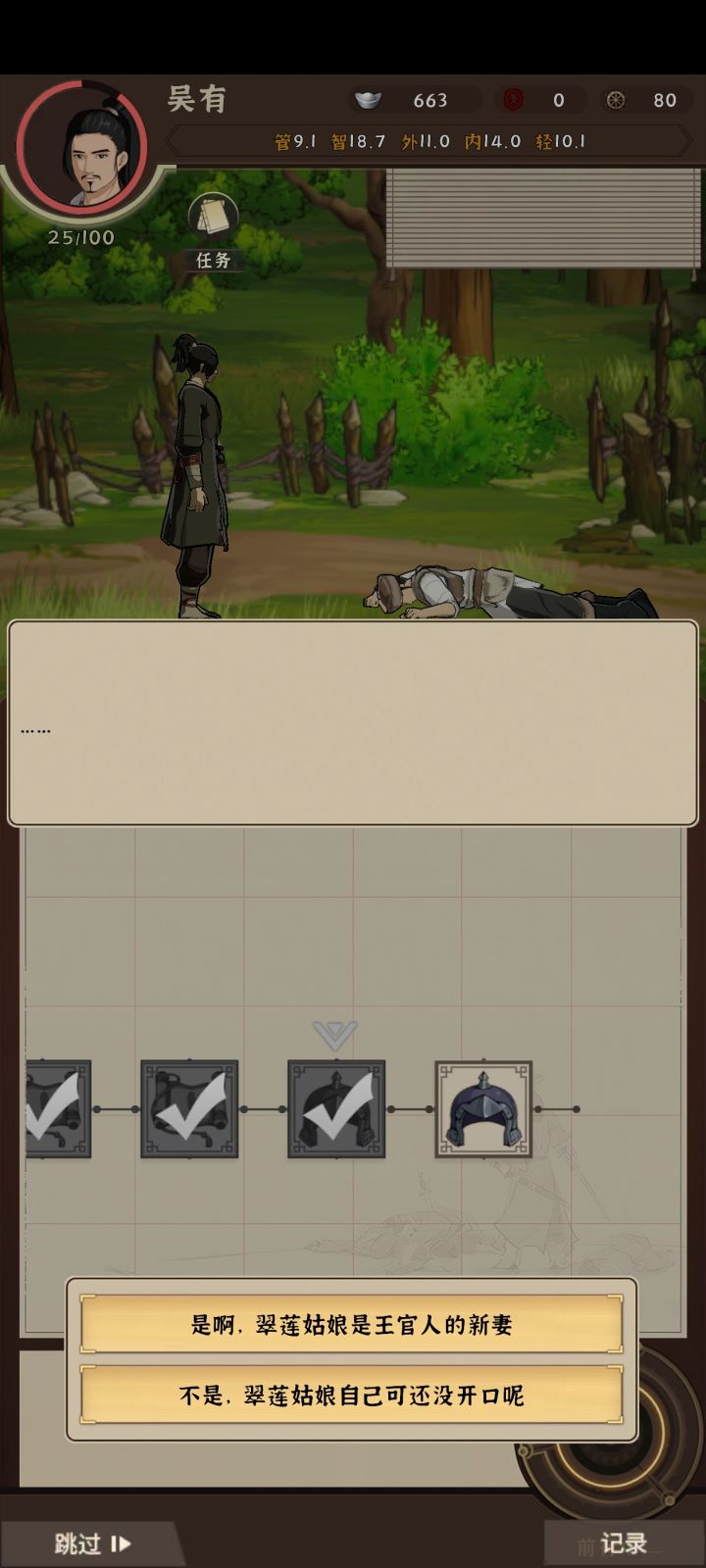 门人招募:胸口碎大石1.需要触发1年2月的地图事件《黄河三圣》,并且不能打赢(一般推荐专门弄一个档去招募,因为很难不打赢……)。2.后续地图事件《奇异的音乐》再去触发,会给一个南山乐谱,研究后解锁一个成就,然后可以拉他进门派。门人招募:李大前置事件:富贵庄的刘管事,对话后去找三个农民,李大这边打赢他就可以入队了。门人招募:何二前置事件:1.《飞沙走石》几个小混混从银鼠帮偷了一本秘籍来看;