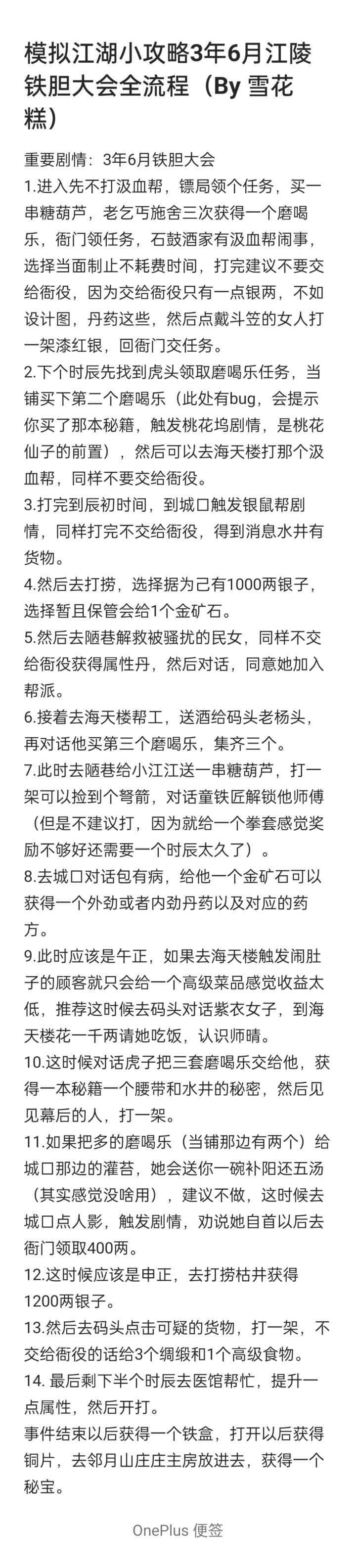 重要剧情:3年6月铁胆大会1.进入先不打汲血帮,镖局领个任务,买一串糖葫芦,老乞丐施舍三次获得一个磨喝乐,衙门领任务,石鼓酒家有汲血帮闹事,选择当面制止不耗费时间,打完建议不要交给衙役,因为交给衙役只有一点银两,不如设计图,丹药这些,然后点戴斗笠的女人打一架漆红银,回衙门交任务。2.下个时辰先找到虎头领取磨喝乐任务,当铺买下第二个磨喝乐(此处有bug,会提示你买了那本秘籍,触发桃花坞剧情,是桃