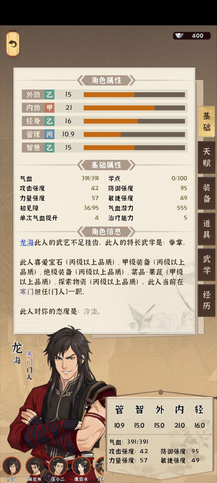 打不过人就重开选聚气 大蓄 操控护盾三个天赋+内劲随到15+,身法10,管理低点无所谓进去后护卫学武功前存档,一直刷到有【标记的】前缀的武功就可以开始游戏了,标记的武学能让你平a伤害附加十几二十倍到百倍的真实伤害,也就是平a打人几滴血然后附带二三十真实伤害并且可以叠加的越打越痛到后面打一下几百血,标记的前缀数值越高叠伤越快 伤害越高最好搞到+40以上然后镖术这个武学能随到标记的前缀那你就爽了,