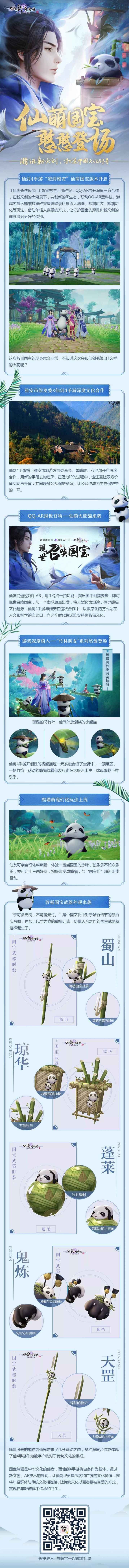 《仙剑奇侠传4》手游在之前就已宣布与滋润雅安,QQ-AR展开深度三方合作,在新文创大背景下,共创新的IP生态。同时,仙剑4手游联动QQ-AR黑科技,游戏内植入熊猫故里雅安碧峰峡景区复原大地图,熊猫时装,熊猫幻化等玩法,借助年轻人喜爱的方式,让守护国宝的愿景和新文创的理念得到更好的传播。那么,这次国宝熊猫在游戏中的现身,意义非同寻常,又与仙剑4手游碰撞出了怎样的火花呢?全新呆萌国宝时装因为仙