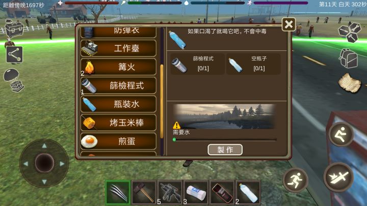 准备(空瓶,过滤器),然后去湖边,打开制造系统,选择“瓶装水”,然后点击“制造”就行了,如图