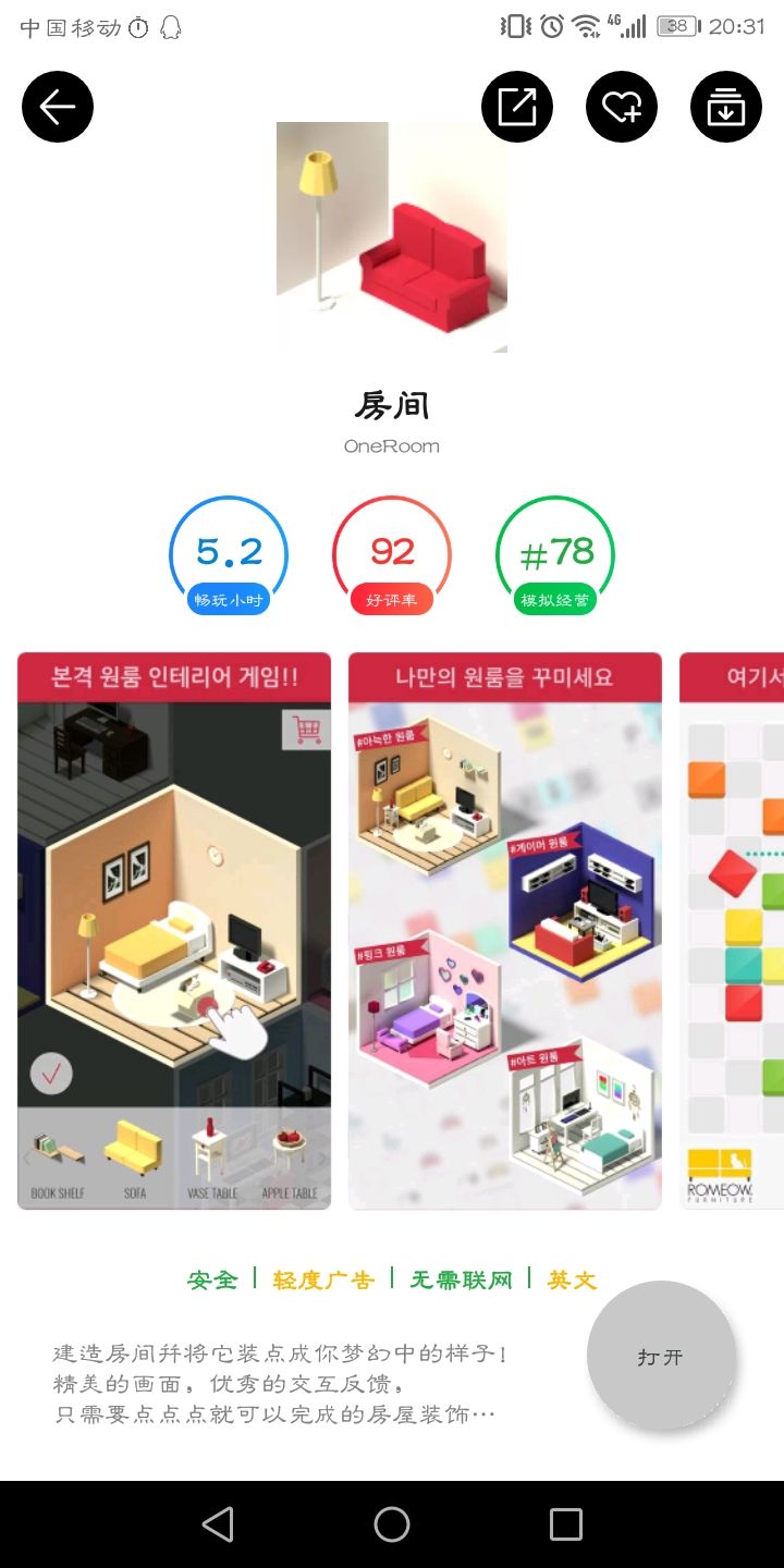 ✨发现one room实属巧合,因为经常在Google play上面闲逛,所以意外发现了。现在我的房子终于建好啦!!(此处应该有掌声👏👏)✨下面是全景图!💖✨最喜欢的几个小房间!👆这个其实是监控室?或者说是服务中心啦,就总管整个区域👆超大圣诞树🎄浓浓节日气氛哈哈👆粉粉少女心!都是喜欢的单品💖👆夏日打卡胜地之游泳池💙ins风啦啦啦👆两个可爱的小房间!对称系列👏游戏玩法虽然比较单一,但