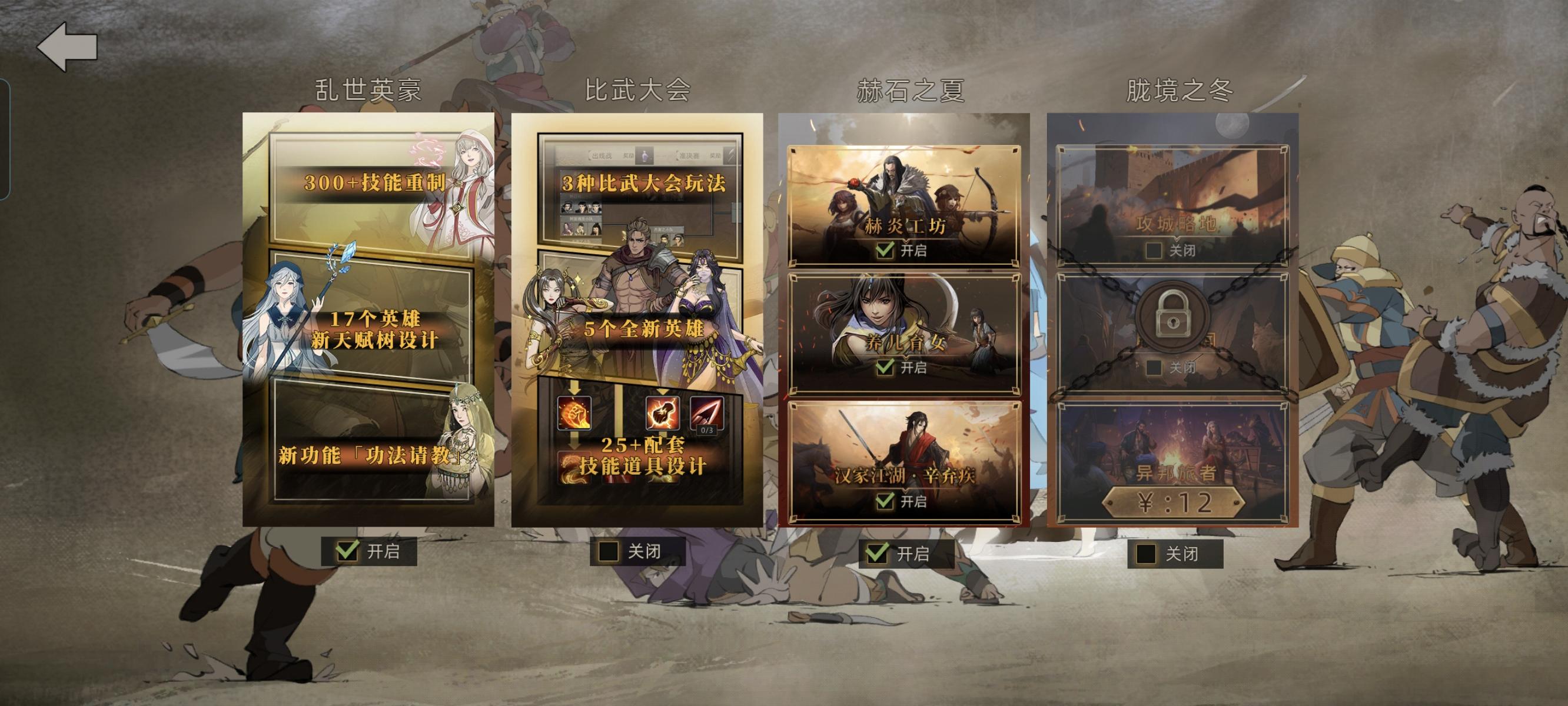 最近看见好多萌新进游戏很迷茫,不知道干嘛,没玩过这类游戏的确实一头雾水(游戏确实没有啥新手指引)就想写一个简单的关于设定的攻略。一.游戏购买的问题游戏分为本体和DLC另外购买的模式,本体25(有时候会打折)我们就不多讲,主要聊下4个DLC1.乱世英豪-买游戏赠送的DLC改了很多英雄技能,并且可以学习伙伴的技能,因为不要钱不多讲yyds2.比武大会-8元 说实话,一般。玩法挺鸡肋的,没啥