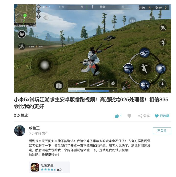 周雷武:这是玩家小米5X的测试视频,还是比较卡的,有明显的丢帧,说实话,我们现在还处于top50阶段。。。链接地址:江湖求生 已于2018年1月19日在AppStore开启预约下载,各位小伙伴可以预约起来啦,正式发布后就可以自动下载了。
