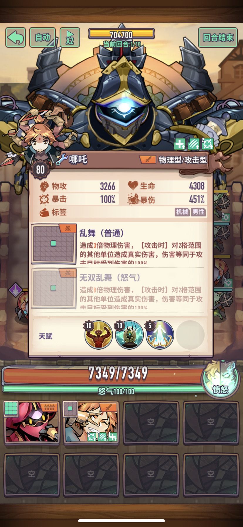 哪吒专属我只有头盔和身子,所以只能给这两件的测试结果,另外两件看着是大加强,可以看看氪佬们。但不管怎么说,这两件的加强从数据上看也应该超越自适应,因为在20%的增伤上多了10%的物攻,然而我测试下,哪吒专用的10%增伤并未实装。 伤害计算方式之前的浪味仙大佬有给出,具体可以参考他的帖子,我这里简单列一下:我的面版是3266物攻和4.51爆伤,哪吒自身的A类增伤第一回合是50%也就是1.5倍率,B类