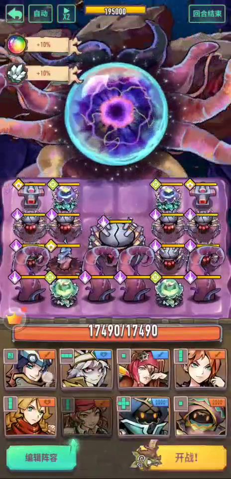这次巨像比较简单,开局增伤秒小怪,没有圣彼得或者拿破仑的高伤害,右上角飞机也可以用点金处理,前面两回合都可以用来清小怪,其中注意门捷列夫debuff要打到中间和巨像,这样第二回合就可以给巨像禁疗尽快消灭,只剩中间蜘蛛以后就按视频操作打即可
