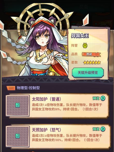 “听从女皇的号令!”伊丽莎白一世阵营:猫族类型:物理型/攻击型品质:传说擅长:群体强化技能介绍普通技能:黄金时代造成1.5倍物理伤害,再次行动(1场战斗1次)。怒气技能:女皇的蔑视造成3倍物理伤害,【消灭目标时】再次行动。天赋介绍天赋1<射手克星>:对具有“射手”目标提升伤害提升5%。天赋2<王权>:对非首领目标伤害提升4%。天赋3<帝皇之眼>:暴击伤害+25%。骑士