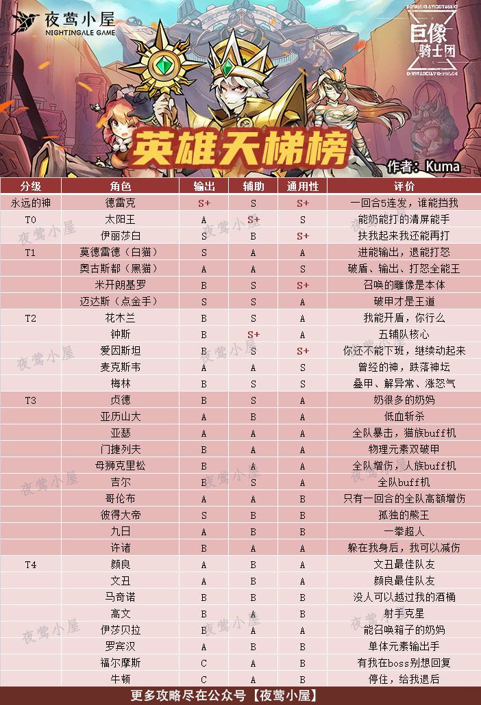 今天为大家献上,台服全英雄大佬Kuma精心为大家制作的巨像骑士团英雄天梯榜!更多巨像骑士团攻略欢迎WX搜索公众号:夜莺小屋