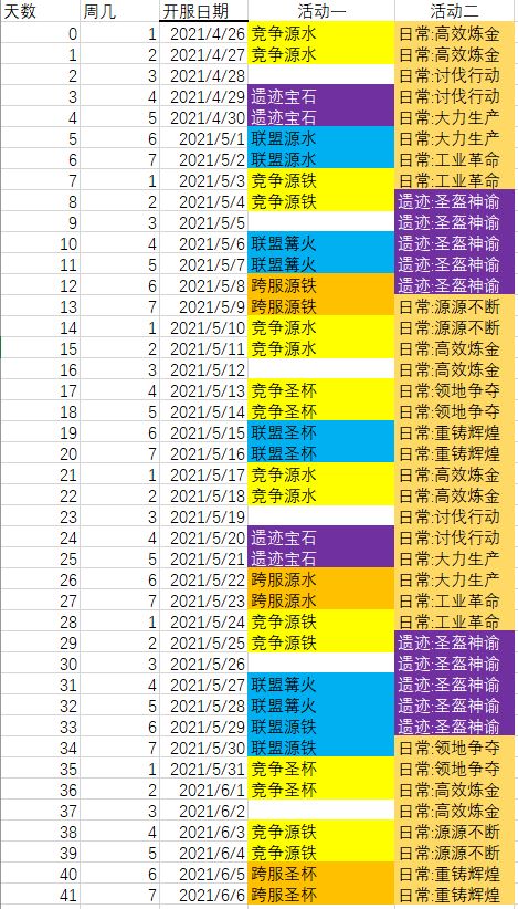 各位奥德镇的镇长大人们:展信佳!今天向大家公布下目前游戏内固定活动的排期,简单给大家说明下游戏内目前活动排期的规则:1、目前新服基本固定在每周五开放,会在开服10天之后进入下表的周期。也就是4月16日(周五)的新服,会从4月26日(周一)进入下表的活动循环。2、所有进入下表的循环,将会固定按照下表,以42天(六周)为一个周期循环下面的活动一和活动二。3、紫色为遗迹相关活动。蓝色为联盟排行