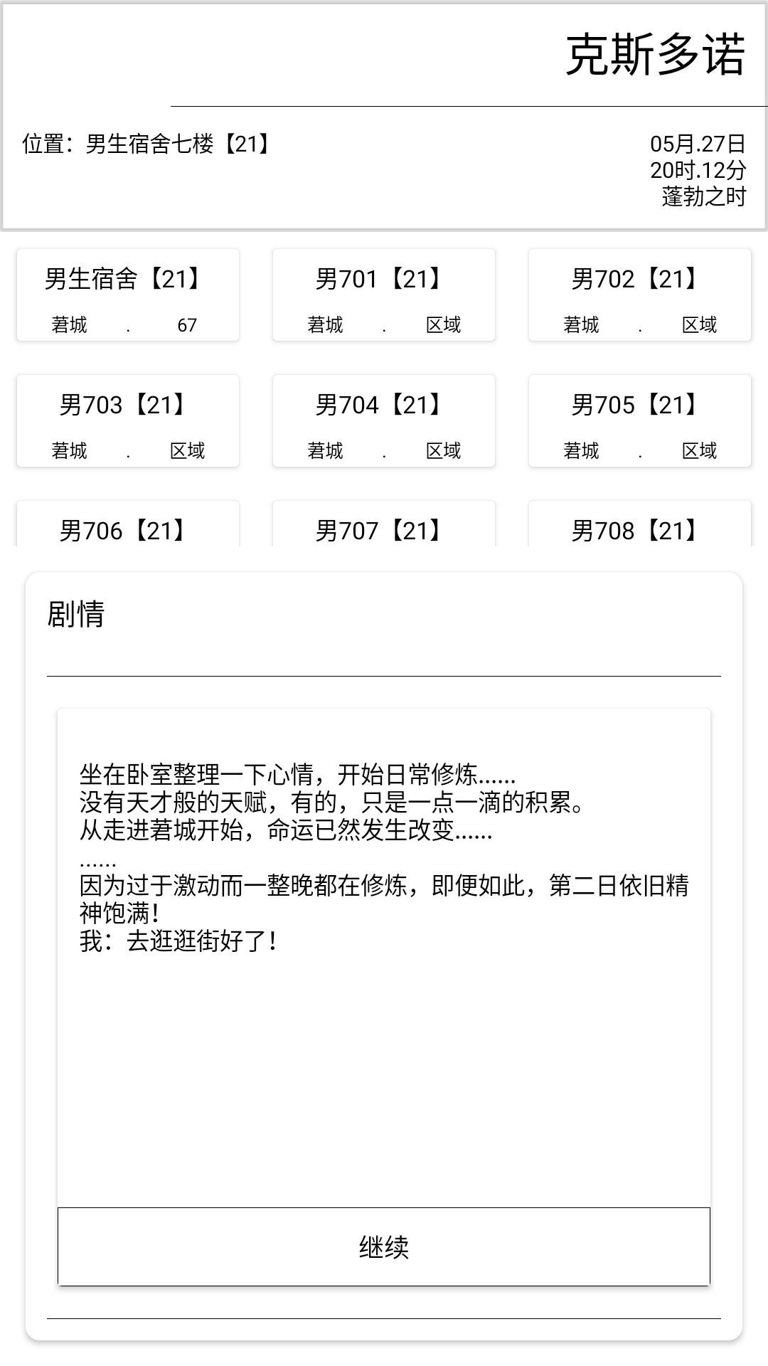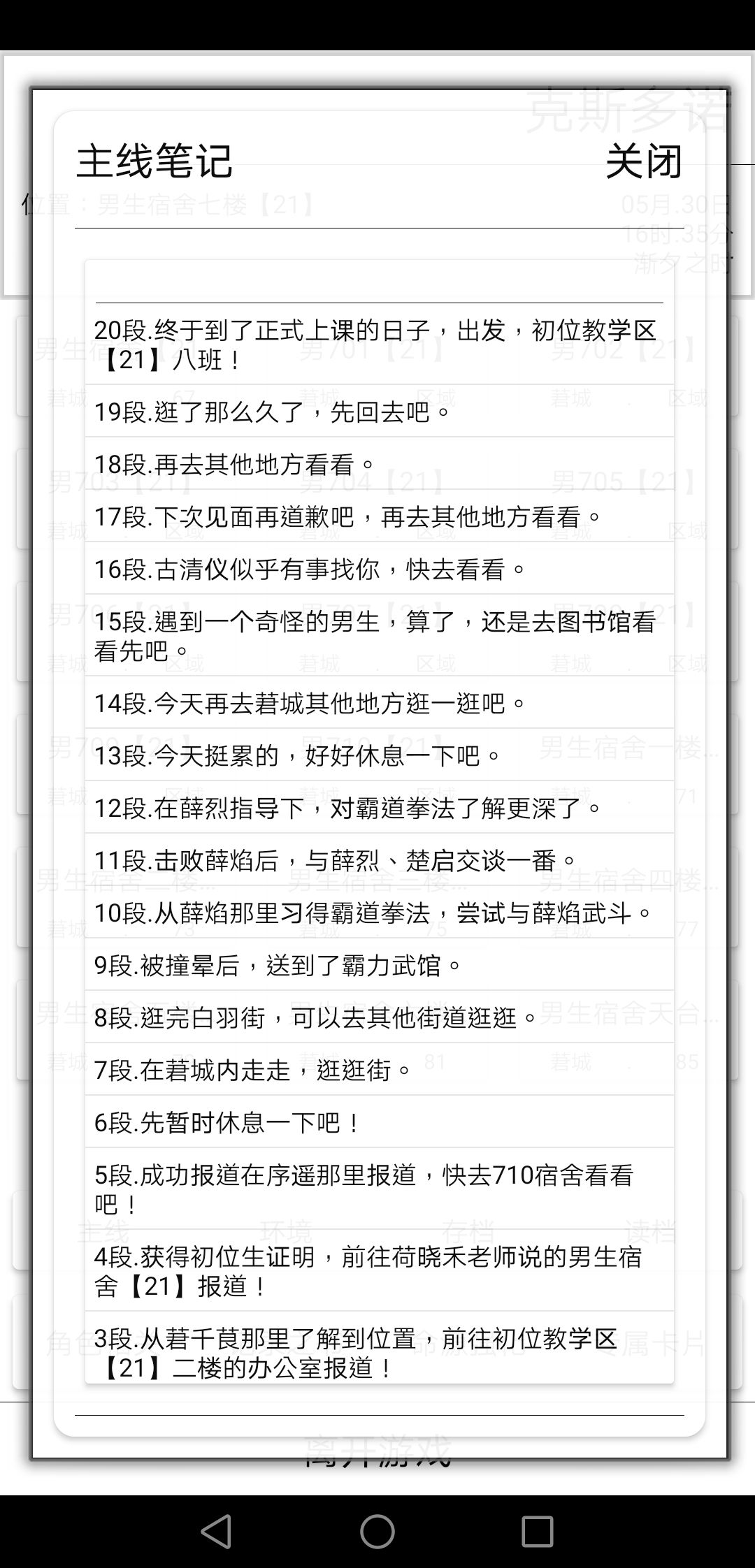 好的,我们的剧情肯定又把各位烦恼到了吧?仅玄给大家讲解一下关于逛街的剧情,其目的是想让玩家熟悉一下莙城的地图(大概),迷路警告。 开始剧情! 在白羽街的白玉道偶遇孟乐三人! 于武道街的尚武路被撞! 被送入武道街的霸力武馆! 从薛焰那里学习新的技能并与之武斗! 结束后准备返回宿舍,第二天继续! 图书馆的草木曲坪遇叶毅。 在图书馆的记文区遇到莙紫芥,发生误会,并被古清仪叫过去。 之后逛街到技玄院的唯像