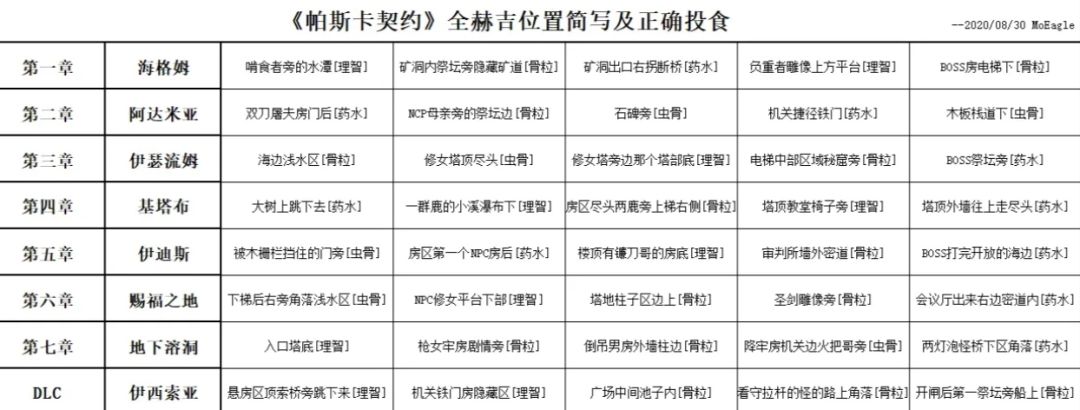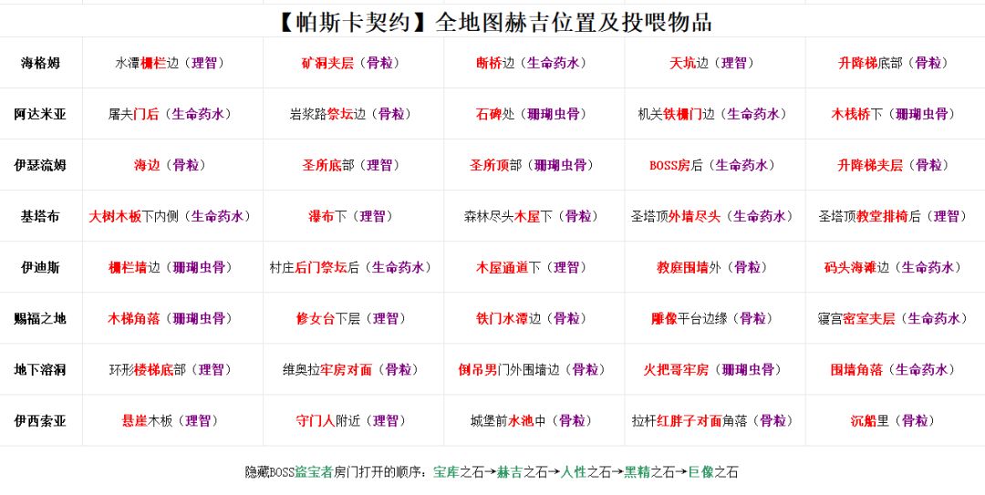 图片看不清?点击图片,下载原图,到手机相册看! 图表主要作用:看投喂物,位置是简写 关键字眼已标红,方便快速确认目标 最下方补充一些赫吉相关的攻略链接 ↓↓↓破碎石板(维奥拉契约物)获取地点 BV1zC4y1W7r3 ↓↓↓本体各章节全赫吉位置 BV1JE411x7jT ↓↓↓DLC遗忘之潮全赫吉位置 BV1yp4y1v7rg (自行复制BV……至币站看,因为taptap显示此贴含其他网站网址,不
