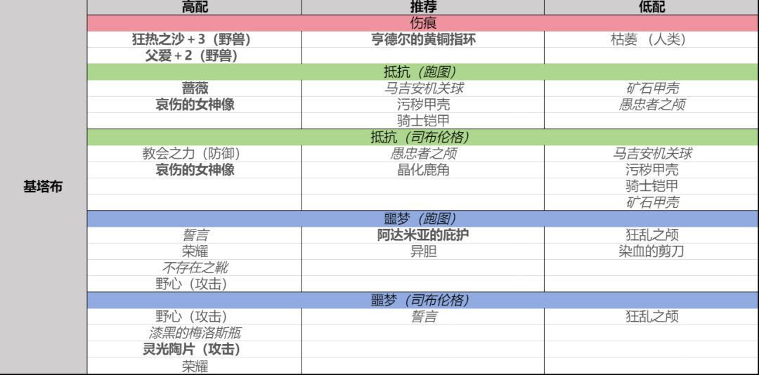 以下排名分高低 极限出装(控残血+控异常): 黑雾套(双圣徽+控异常): 黑雾套(梅瓶+圣徽): 自残套(控残血): 黑雾套(双圣徽): 满血套(满血): 鞋脚六剑奴(错误案例)(因为伤害过于感人而走后门控异常): 备注: 素材中对也仅对自残套和满血套的第一刀控制了不暴击。 黑雾套中均使用了野兽特攻装,抵抗位是愚颅白卵。 遗忘之潮的银桩因为属性过分优秀地位等同黑雾伤痕。 素材中仅在“极限出装”中给