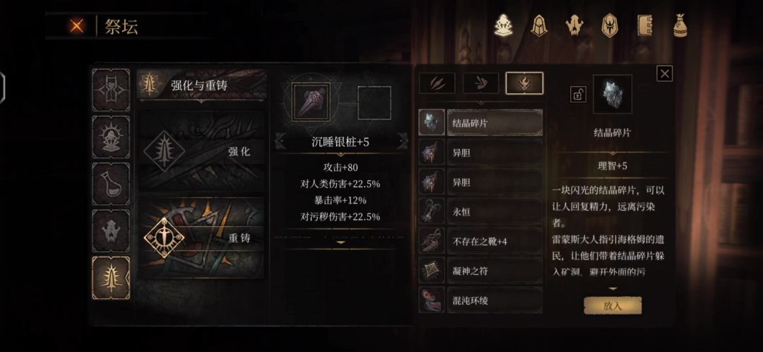 在帕斯卡契约中,沉睡银桩的重铸建议洗掉污秽,将攻击和特攻优先。 沉睡银桩是战利品之一,沉睡银桩+5的话,可以有攻击+80、人类伤害+22.5%、暴击率+12%、污秽伤害+22.5%等的加成,算是还不错,后期慢慢将攻击和特攻放在前面,增加输出。特别是其中12%的暴击率,算是很香的词条。 不同的战利品可以组成不同的搭配,由此产生不同的效果,建议在打BOSS之前,先观察BOSS的习性,由此搭配出不同的战
