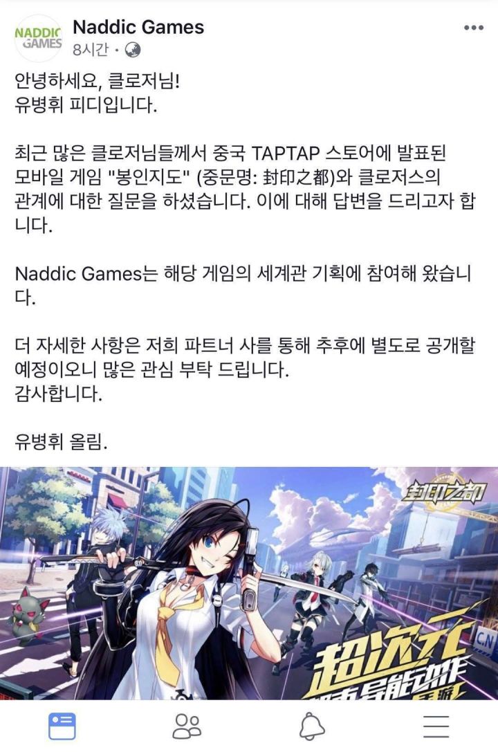 各位指挥官:大家好!近来论坛和留言区有不少针对《封印之都》的质疑问题,给很多不明真相的指挥官带来了不少困扰。针对大家的这份困扰,NADDIC GAMES在官方Facebook脸书页面上也发出了声明,内容如下:翻译文字内容如下:——以下为韩国原文的中文翻译版本——各位封印者们:大家好!我是《Closers》的制作人柳柄輝。近日,我们接到了不少玩家的询问,现在中国TAPTAP上公布的
