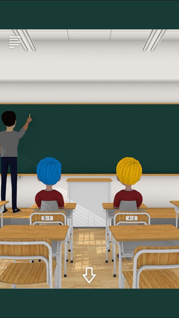 走无厘头的轻松可爱简单的逃脱游戏。曾有一度卡在某关卡,过了后发现是自己想太多了,玩这个游戏最重要细心,逻辑推理倒没太要求。好了,正式开始。根据蓝黄男同学举手顺序,蓝蓝黄黄蓝黄,打开柜子得到铅笔。在帽子底下的到一把美工刀,旁边黄尺子是后面柜子的提示。打开得到乐普,放到钢琴上,走开。美工刀划开柜子上的纸箱,得到墨汁。椅子底的环提示,打开柜子,得到铅笔刀,点铅笔削尖。黑板的尺子提示打开另个柜子