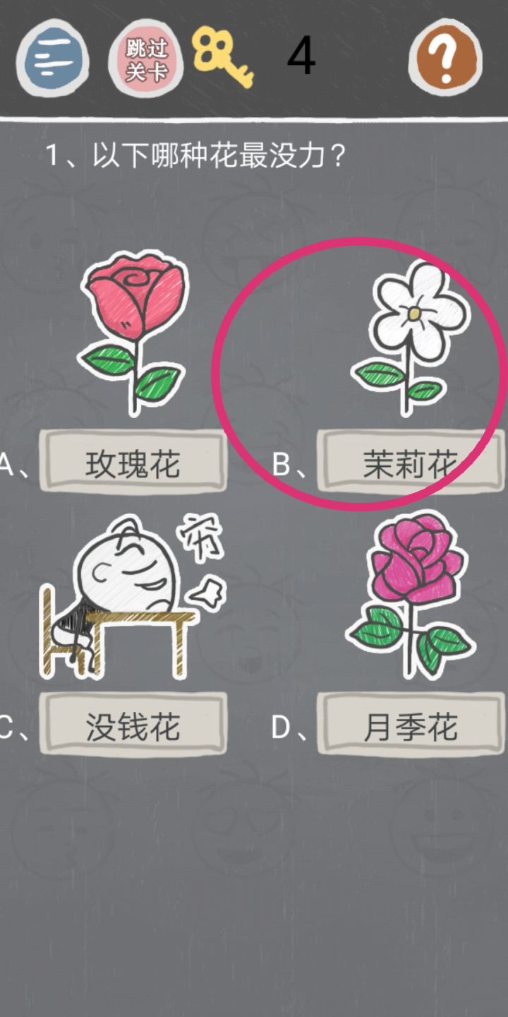 我是第一次写攻略,做的不好,请见谅第一关选B第二关选D第三关明明(“明明”可以靠脸吃饭,可是偏要靠才华)第四关选A第五关点击圈起来的就可以了,注意题目上的“气球”第六关不要相信题目,数鱼缸里的鱼第七关选B第八关选A第九关选D第十关选B后面的明天再更