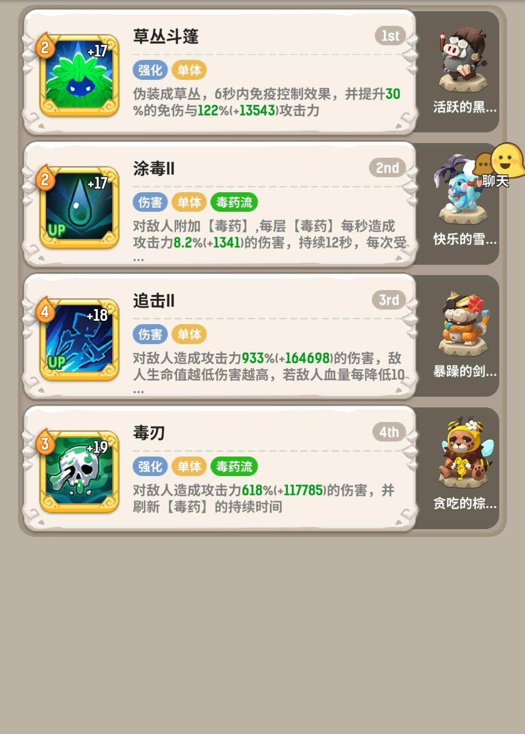 酒仙刀疤兔 战士 强袭(骆) 巨人(三) 作战(雪) 过来(鹿) 小德 乌克(猪) 庇护(雪) 守护(女) 绽放(蟹) 白独角猩首领 战士 嘲讽(骆) 重拳(三) 作战(雪) 强袭(鹿) 小德 乌克(猪) 绽放(羊) 庇护(雪) 新生(蟹) 魔化的黑熊首领 战士 强袭/重拳(雪) 重拳/强袭(骆) 蓄势(三) 作战(鹿) 小德 乌克(猪) 庇护(雪) 守护(女) 绽放(蟹) 闪耀的猛犸 战士 重拳