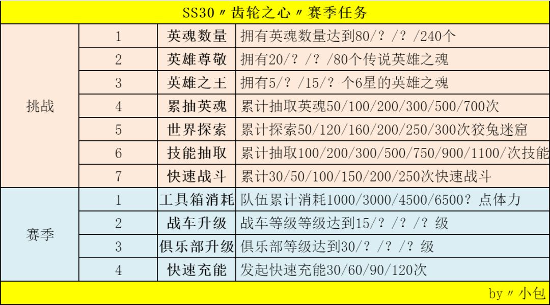 SS30赛季玩法是全新的拼车大对撞玩法,需要掐的是夜里10点的这个点。 因为是全新的赛季,所以也没有之前的经验可参考。 我会在接下来的时间里尽可能详细的挤出一篇攻略给大家作参考。 因为也是第一次玩,所以有遗漏或者不对的地方也请大家指正。 本篇仅介绍赛季任务等内容。 (累抽:700英魂/1100技能券) 8职业武器外观↓↓↓ https://www.taptap.cn/moment/70130005