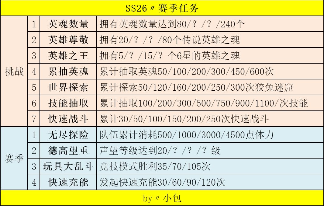 SS26赛季玩法是玩具对决玩法。 新人朋友可以在taptap里搜索SS1/SS4/SS11/SS18/SS22赛季玩法。 这里附上我在SS22玩具赛季的攻略帖子,希望对大家有所帮助。 https://www.taptap.cn/moment/604766653669968998 新赛季对护卫流和召唤流做出了一定的调整,这2个流派会比之前强一点。具体好用与否还有待测试。 (累抽:600英魂/1100