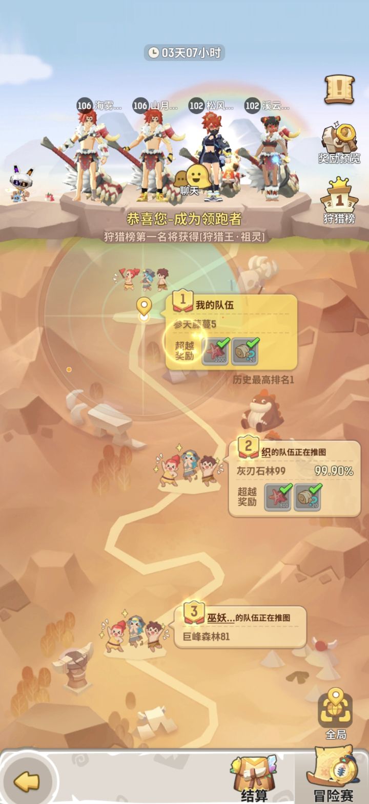 四开零氪,使用老版本的斗刺法德尝试四开冲锋,看看狩猎季结束能到哪里。第一天到了图图平原,输出全靠宠物,人物全员站住即可。我选择的资源尽量换宠物第二天到了普吉冰川,不要在意地上趴着的人物,仍然全靠宠物输出,勉强第六。第三天靠着原始宠物到了呼里峡湾,基本有人活着就有输出。第四天勉强进了第三大陆,过了牦牛迎来了小犀牛。第五天,和小犀牛斗了一天,零氪党硬推的问题就是小犀牛开局必秒一个后排。第六