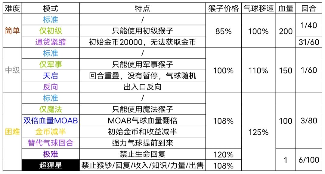 超猩猩模式无法获得额外金钱,所以请不要放香蕉农场,也不要把海盗船升级成下路商船,这些都无法获得金钱,而且买了之后无法卖掉。 最重要的是,不要放本杰明!不要放本杰明!不要放本杰明! 本杰明的技能在别的的模式下,可以更好的理财,但是在超猩猩模式时,因为无法产生额外的金钱,还会用技能吞掉气球,就变成了完完全全的亏钱,让本就金钱紧巴巴不够花的四个人雪上加霜,最终崩掉战局。 所以不想如果让队友发来一大堆问号