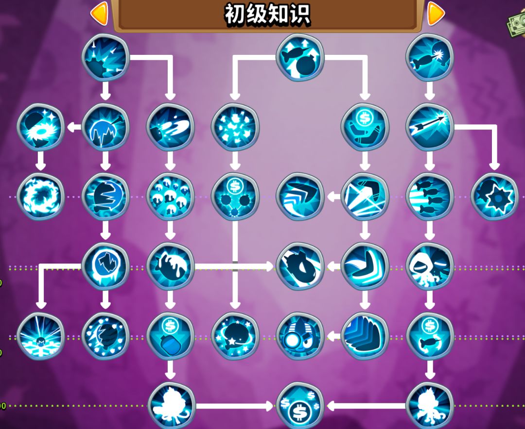 一.内容前瞻 本篇文章含有大量知识解析 数值类+1会酌情跳过 气球塔防中,知识有六个大类 其中的核心知识,能让你事半功倍 部分知识效果来源官方wiki 二.知识介绍(多图预警) 初级,军事,魔法,支援,英雄,力量 为了方便检索,会按照以上顺序逐一解析 延长存在时间:初看毫无卵用,实则暗藏玄机。其中刺钉塔最为明显,攻击距离近乎翻倍 大家一起来:初看很厉害,减费难触发 必须场上所有初级猴子满足阶级条