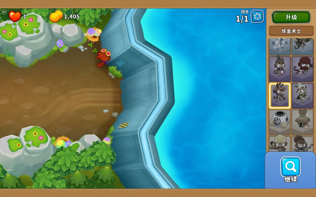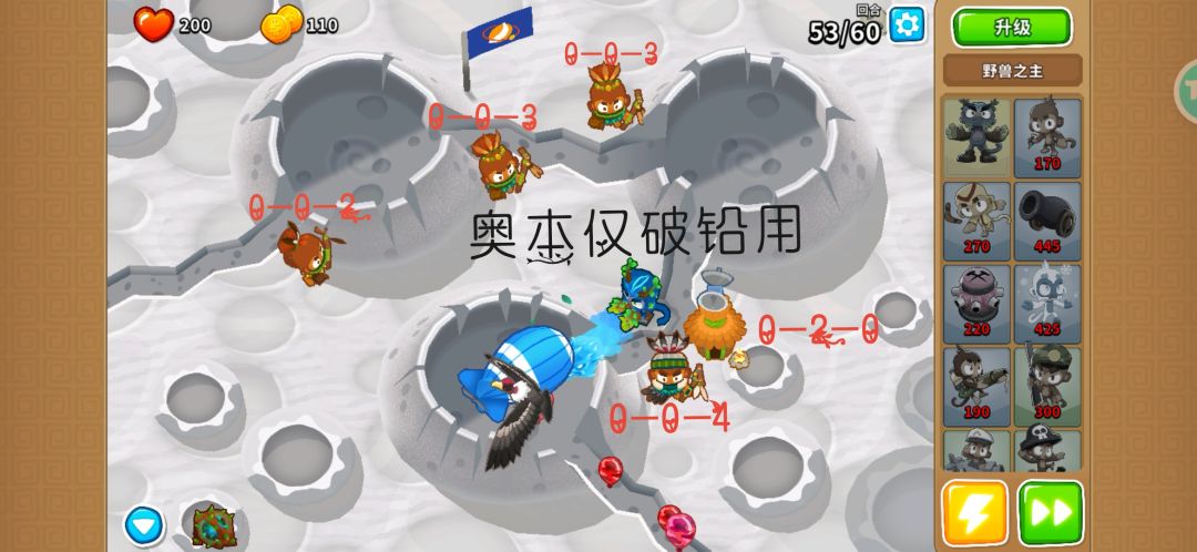 用登月这张图,通货紧缩,能打到80回合,纯挂机稳得一批,所有气球都过不了第一个坑。 看着第一张图去摆,先把阶升了,然后上面三个合并到下面的0-0-4,再用0-0-4的野兽之主瞄准第一个坑的中间就可以了 奥本的作用只是为了破铅气球和迷彩铅气球,技能完全不需要用,而且他的攻击可以穿墙,这个陨石坑就是用墙围着的。 第80回合的绿飞艇老鹰根本就不打,所以到80回合就结束了,60回合打完可以点下屏幕接