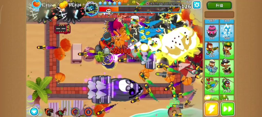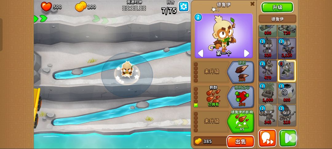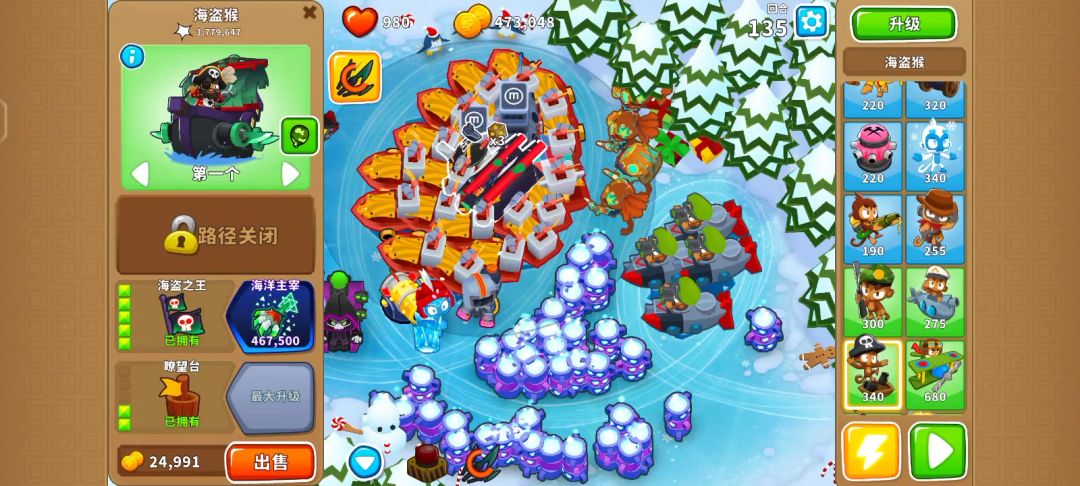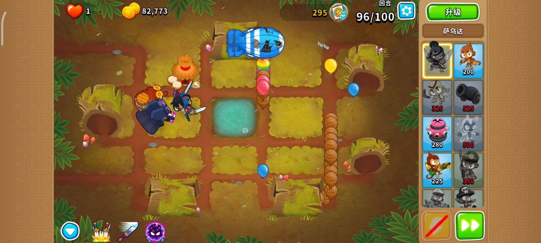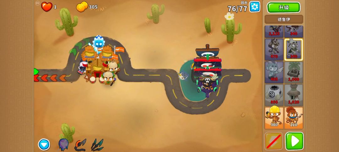 有一定难度(有点磨叽,但是能过) 开局000冰猴,下面2个002猴村,最下面的猴村402,230德鲁伊,052冰猴(攻击带全屏冰冻) 005海盗,400潜艇(海盗先出等cd) 76波开局气球走到最右面,放冰猴技能,用德鲁伊慢慢耗(003的德鲁伊藤蔓无视血量),看情况放冰猴技能 77波开始,卖冰猴,卖猴村,卖德鲁伊,出005胶水,有余钱出040海盗(海盗钩子技能无视血量)