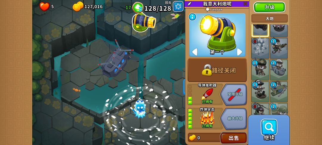 025大炮,052冰猴,240直升机,利用大炮的被动,冰冻气球和用直升机吹,只扣一个陶瓷的血,连续两次即可过关。