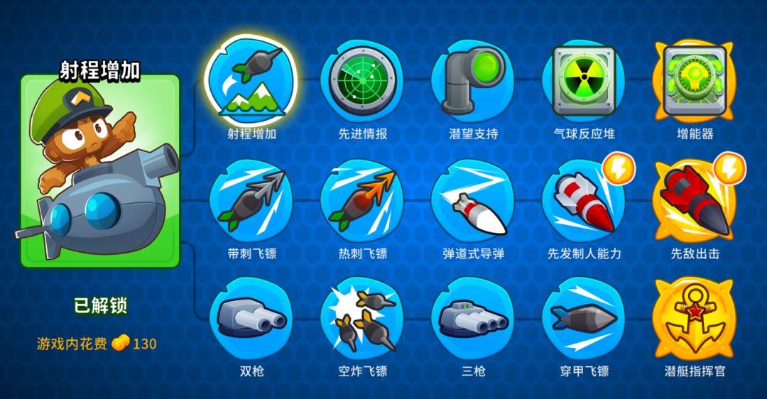 第一支线: 100射程 200拥有共享射程 300能够潜水,除去迷彩属性 400小AOE伤害,水面猴子CD减15% 500伤害,所有猴子CD减20%,水面猴子CD减50% 潜艇攻速受001和002增益 潜艇破铅受020增益 第二支线: 010伤害 020破铅 030伤害 040秒杀ZOMG飞艇 050自动伤害 第三支线: 001攻速 002伤害 003三线射手 004MOAB伤害 005攻速,伤害