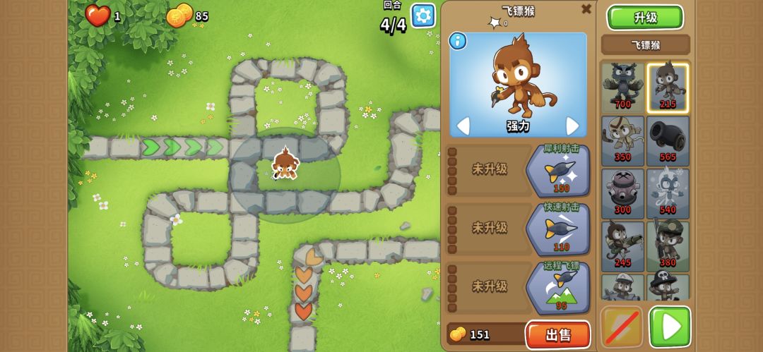 1.开局图一位置放个飞镖猴(主要目标:强力) 2.打够钱升级快速射击(选强力主要打蓝气球) 3.气球到达图三位置快速卖猴(蓝气球基本消灭) 4.图四快速买猴放置打完剩余红气球 5.蓝气球要基本消灭(余2个都容易翻车),卖猴,买猴速度要快(不要开二倍速)