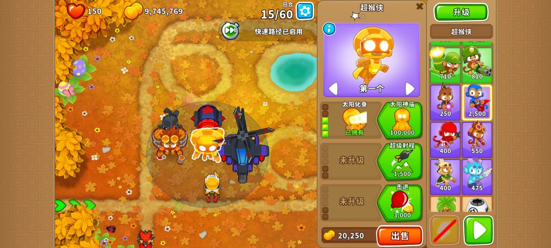 #气球塔防6 关闭快速路径开始游戏,第一回合先不放英雄,过一回合后保存退出,打开快速路径重新进地图,这时候再放英雄,对应的就是快速路径模式下的英雄等级。用这种方法可以白嫖英雄等级