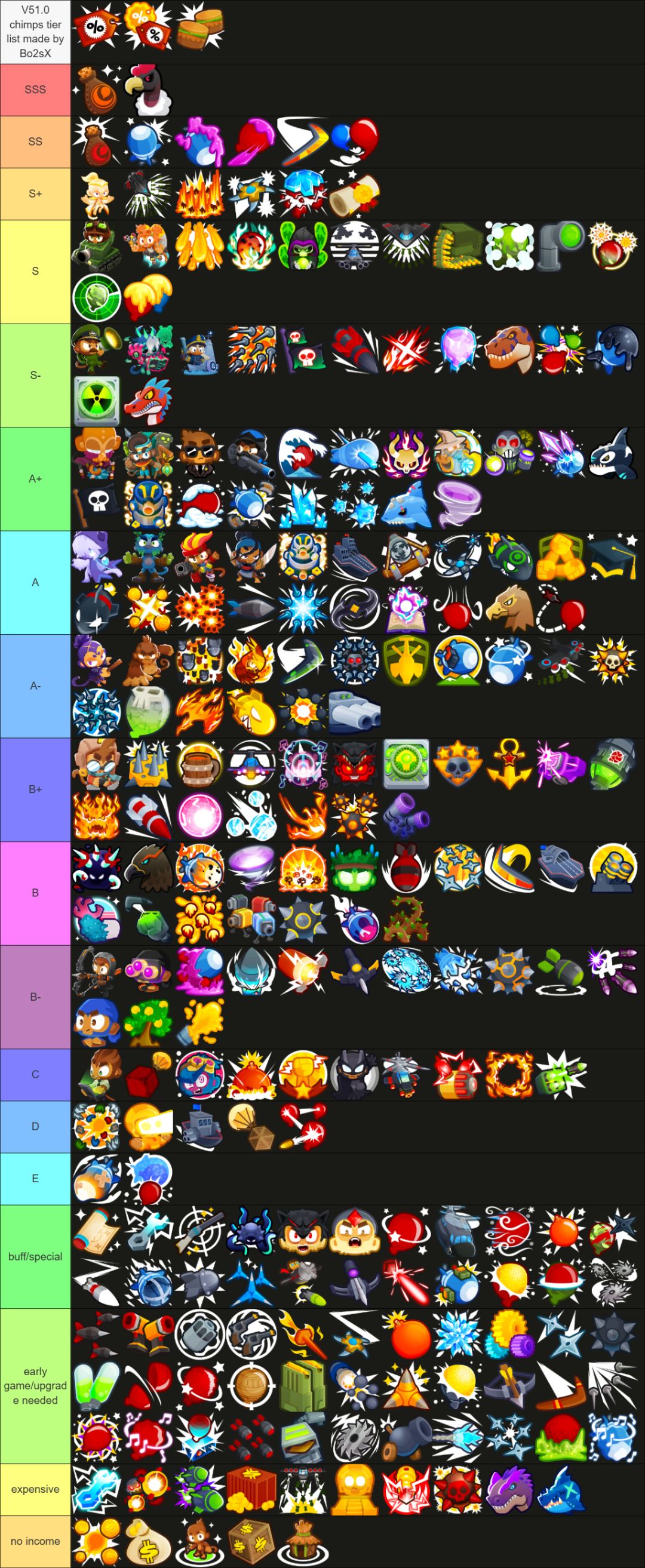 英雄:灵机 提示:照片里的猴子摆放很重要,虽然我这么摆有点问题,但问题不大 一:开局 1,毛+狙开,摆放如下即可,俩都优先打强力目标 2,陆陆续续再补上3个狙,前俩打强力,最后一个打第一个 3,攒钱,出灵机(灵机离狙和毛远一点)。把之前的一个强力狙改第一个,再补两个狙,一个打强力一个打第一个。 4,出一个德鲁伊,升030-130 5,在灵机旁出直升机,升302,然后可以打飞艇了 二:中后期 1,出