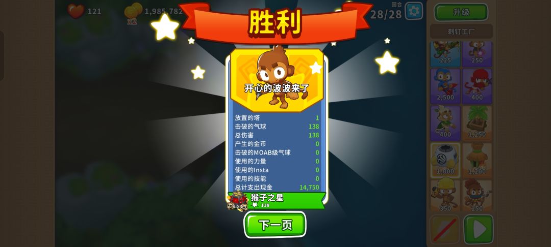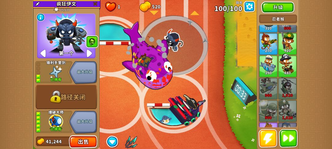 英雄:萨乌达 一:开局 1,萨乌达开 二:40回合前 1,萨乌达正下方放潜艇 2,靠边边的位置放海盗猴,要把攻击范围的边缘尽量与气球路径重合,直升320 3,原海盗猴旁边出另一个海盗猴,升042,用技能秒杀飞艇 三:中后期 1,猴村220,刚好覆盖所有就行 2,海盗猴升520 3,潜艇升502 4,海盗猴升052 四:大后期(主要是讲讲90回合后怎么打) 1,首先是购买方面,如下图购买即可,猴村2