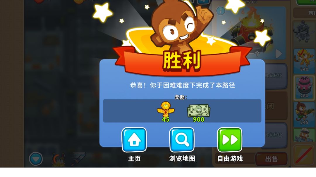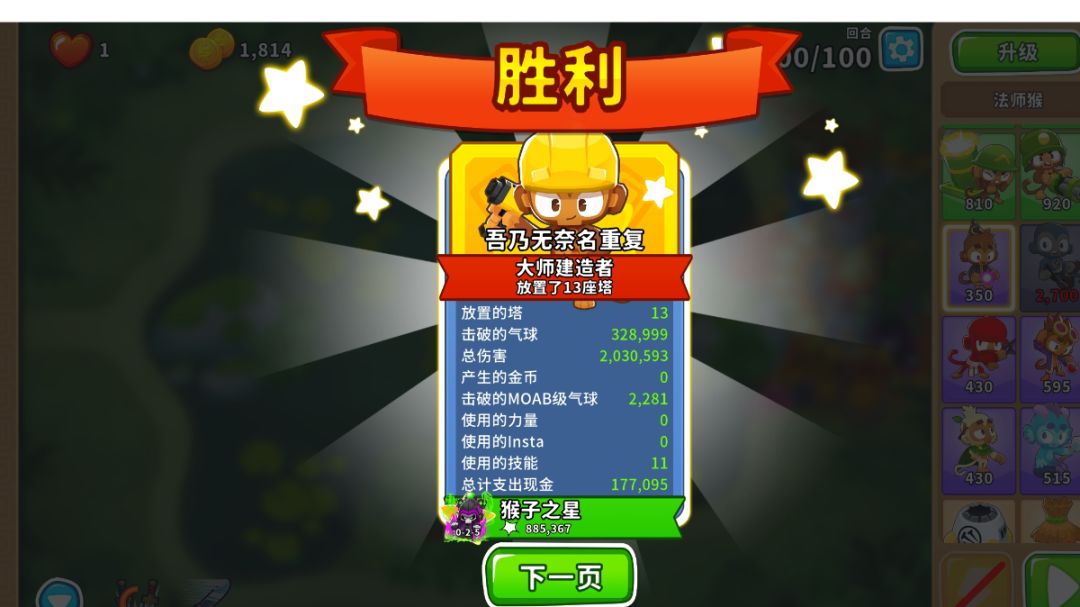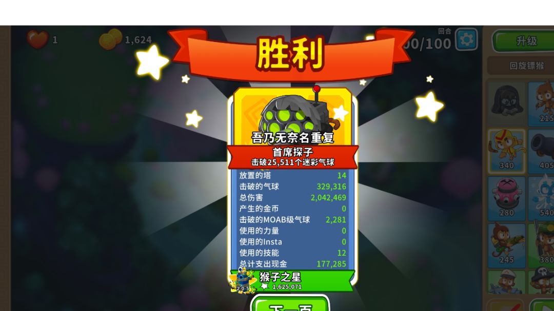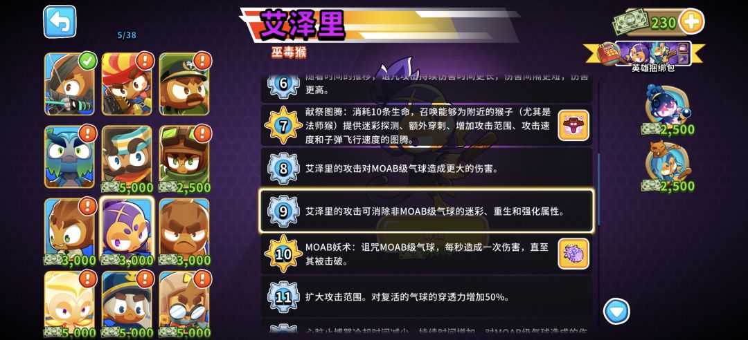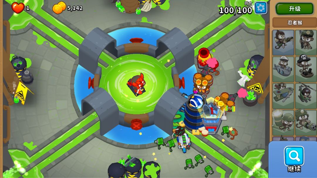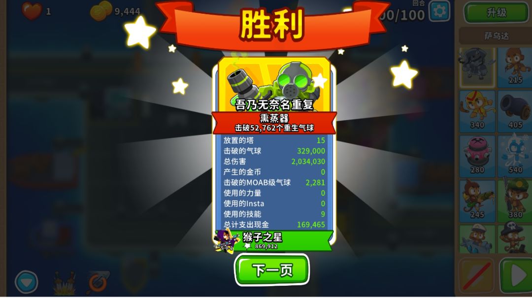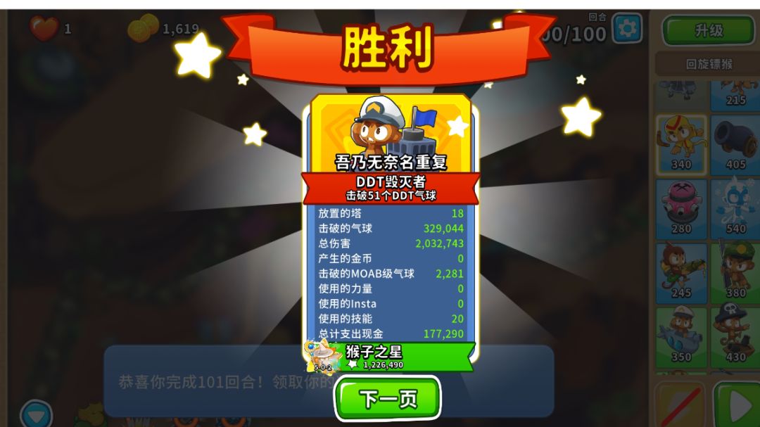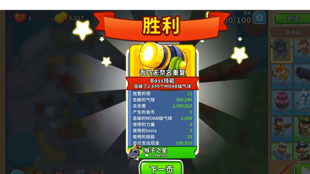 英雄:萨乌达 一:开局 1,萨乌达开 二:40回合前 1,萨乌达正下方放潜艇 2,靠边边的位置放海盗猴,要把攻击范围的边缘尽量与气球路径重合,直升320 3,原海盗猴旁边出另一个海盗猴,升042,用技能秒杀飞艇 三:中后期 1,猴村220,刚好覆盖所有就行 2,海盗猴升520 3,潜艇升502 4,海盗猴升052 四:大后期(主要是讲讲90回合后怎么打) 1,首先是购买方面,如下图购买即可,猴村2