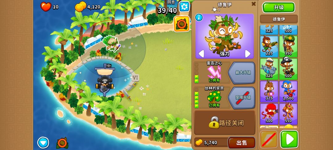 先把德鲁伊240升满,然后一个海盗猴230或140均可,都只差一点点钱升级,开始后金钱够了立马升到240即可 最后MOAB来的时候释放海盗猴技能即可 因为德鲁伊的藤蔓是随机的,所以有可能会漏,多试几次就好了,亲测5次失败1次