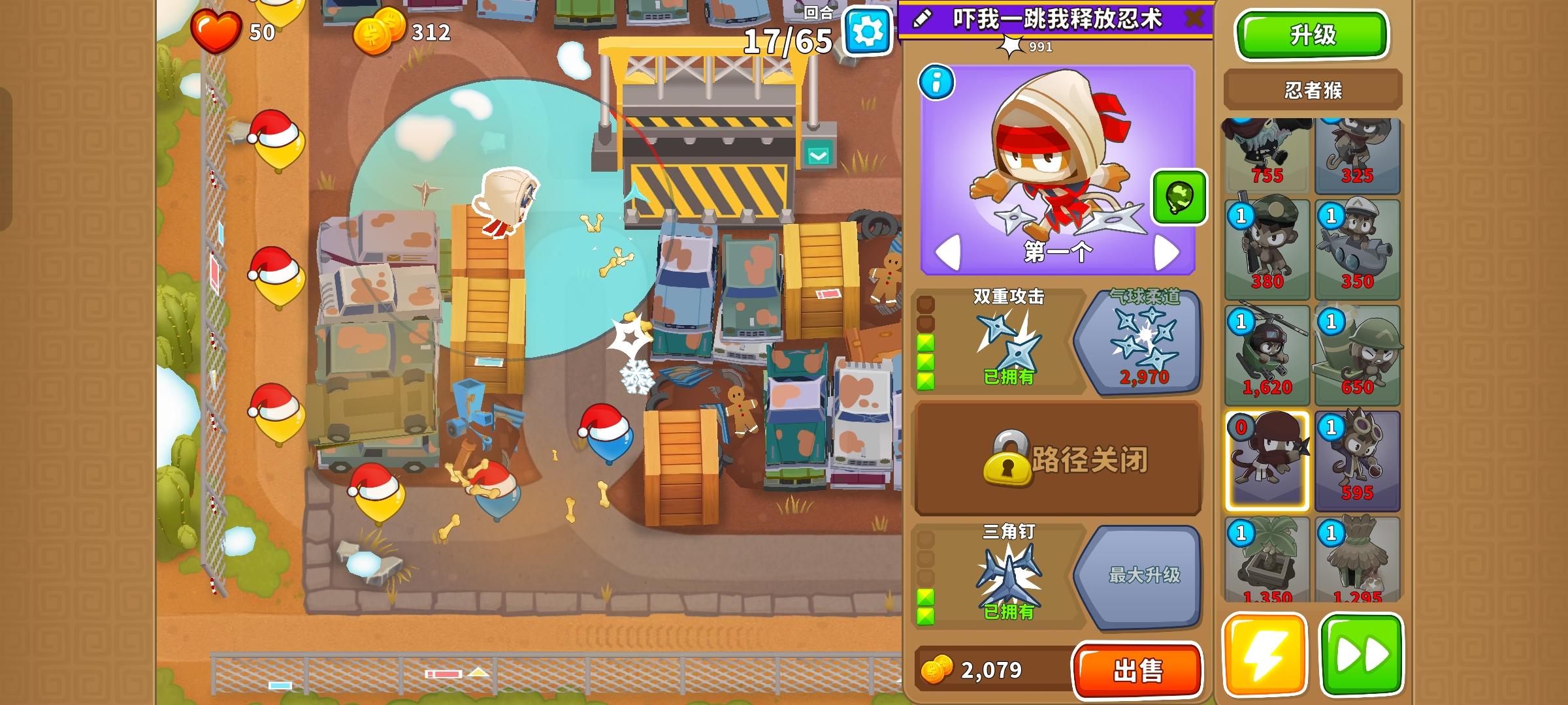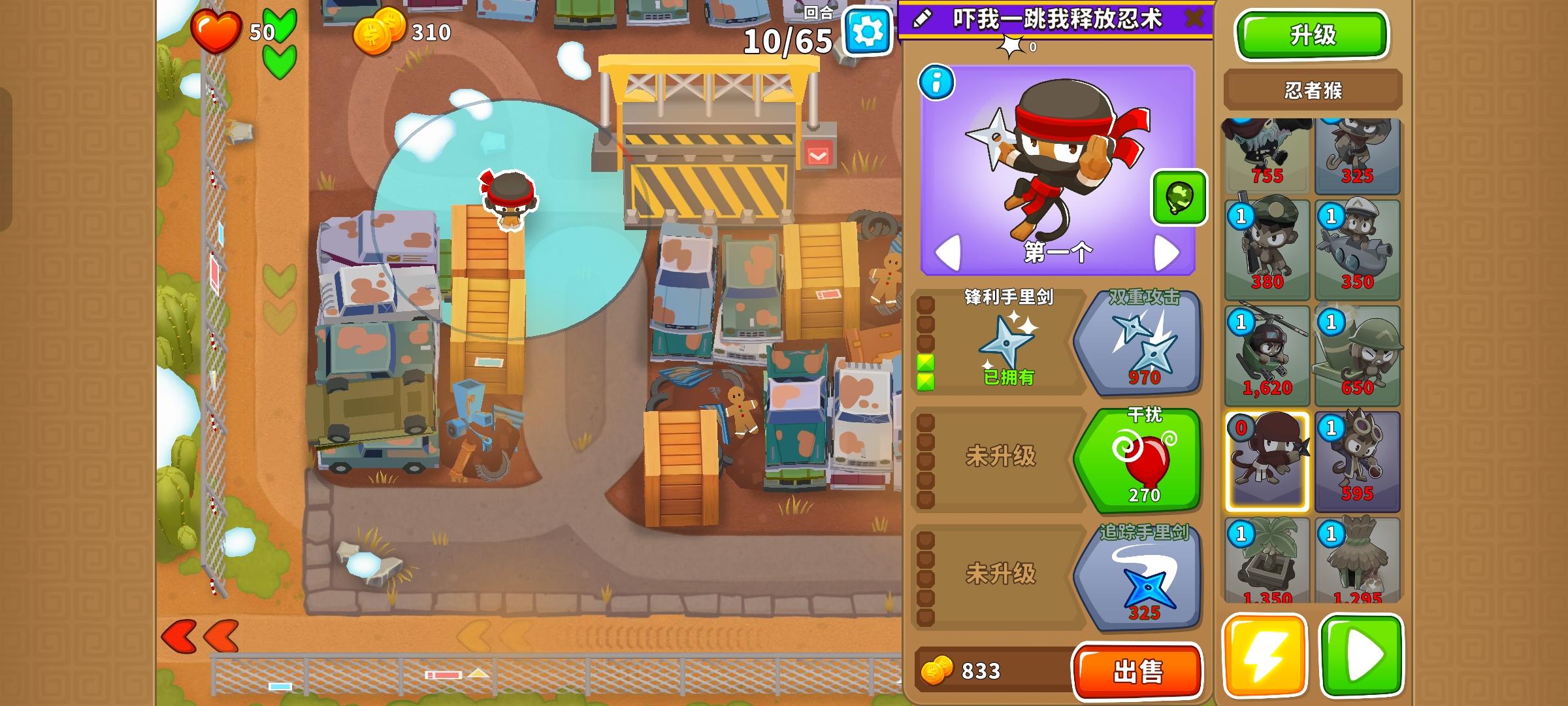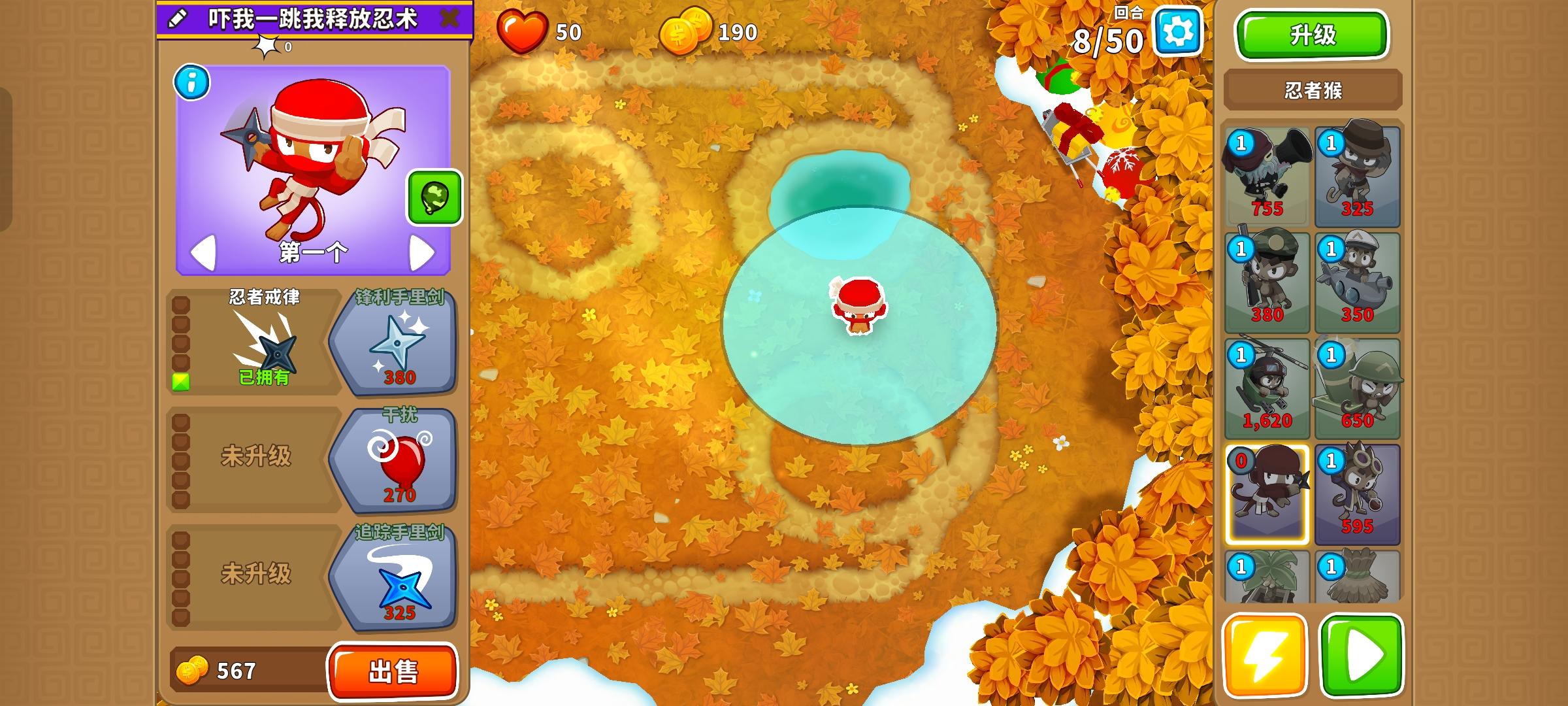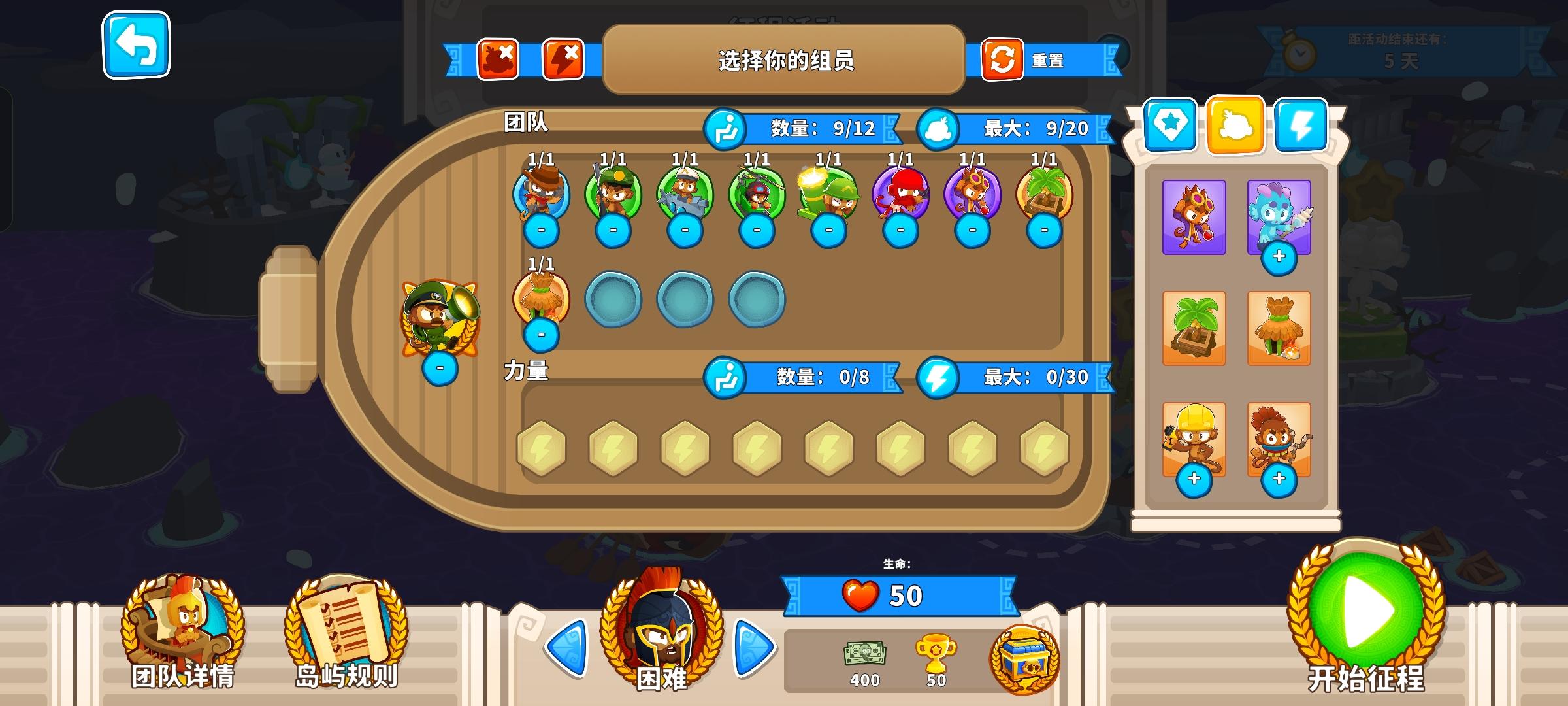 这次的困难征程又是前3岛很简单,但岛4和岛5开始上难度,因此仍然先介绍前3岛,岛4和5分开单独介绍!也不需要知识,力量和双金!只要带上英雄琼斯,亡命猴,狙击手猴,猴子潜艇,直升机飞行员,迫击炮猴,忍者猴,炼金术师,香蕉农场和猴子村就行。无需其他猴子!岛1:开局在图上位置放下100忍者猴,逐渐升到302,再来炼金术师辅助它,可直接升到420再升级忍者猴至402。最后在炼金术师范围内右侧补个230
