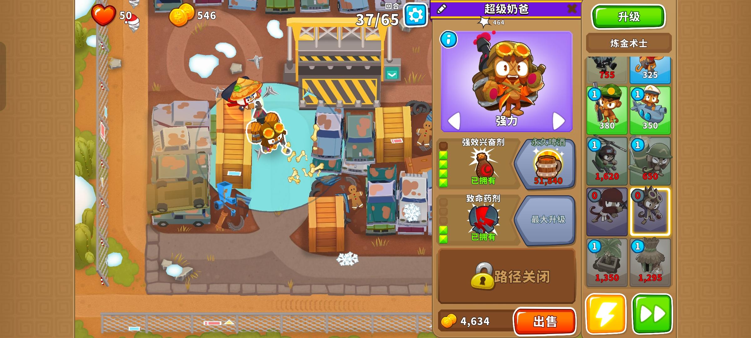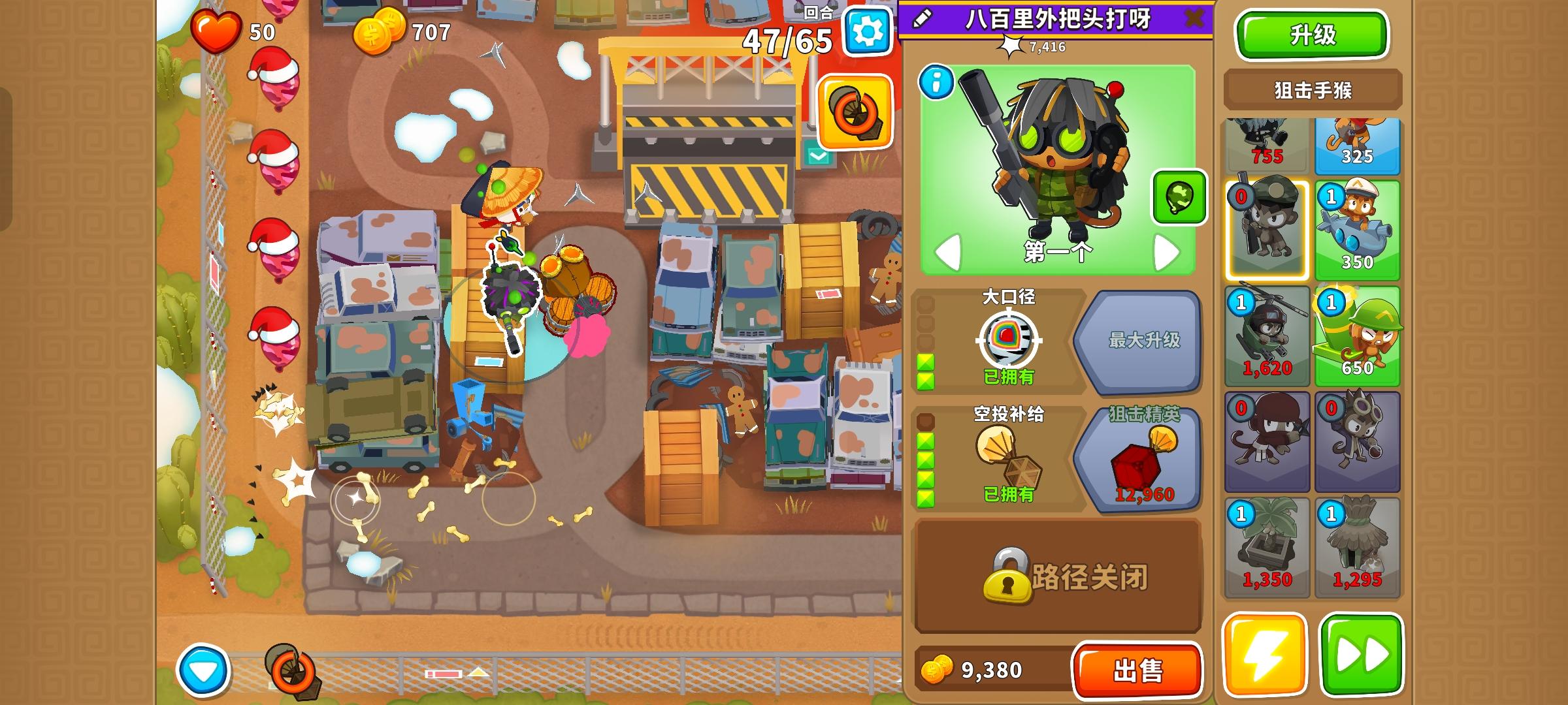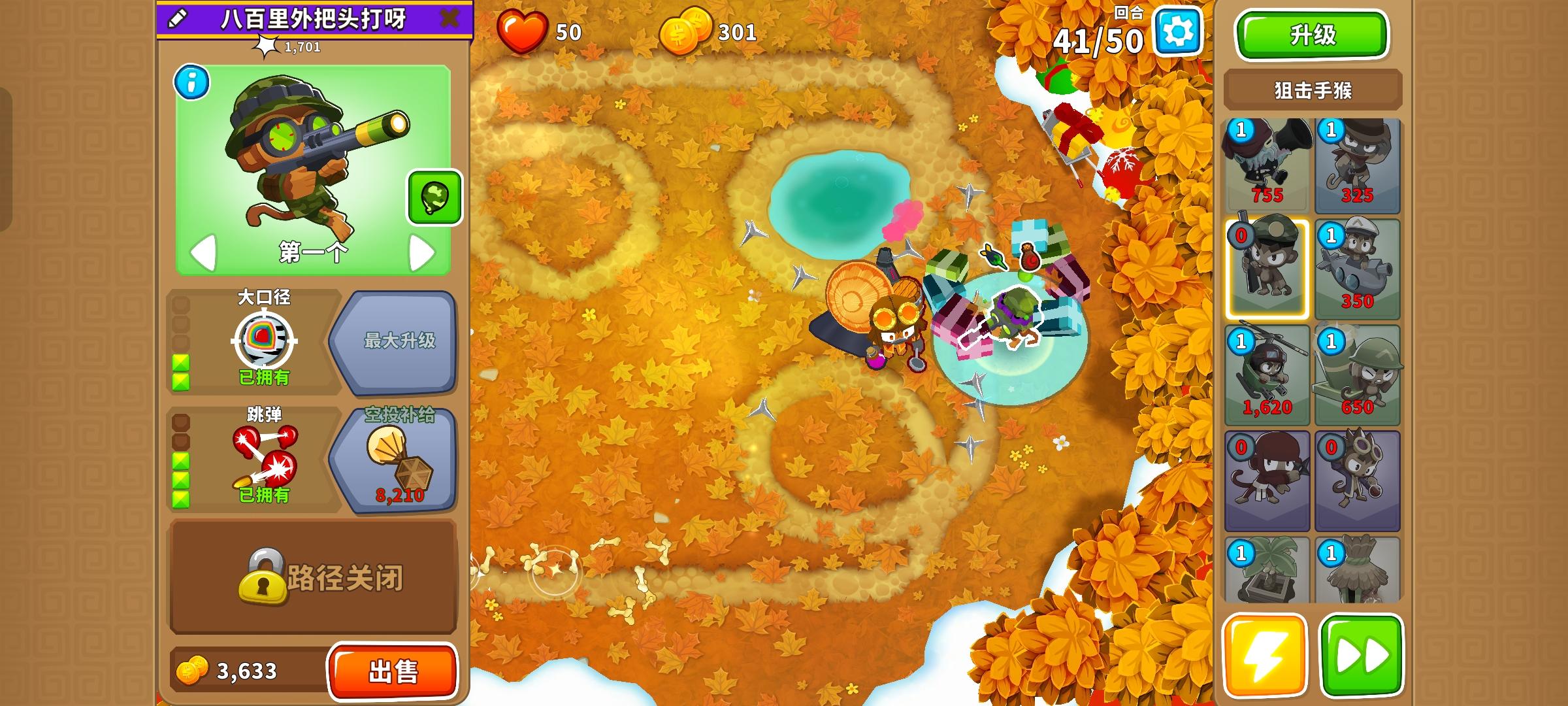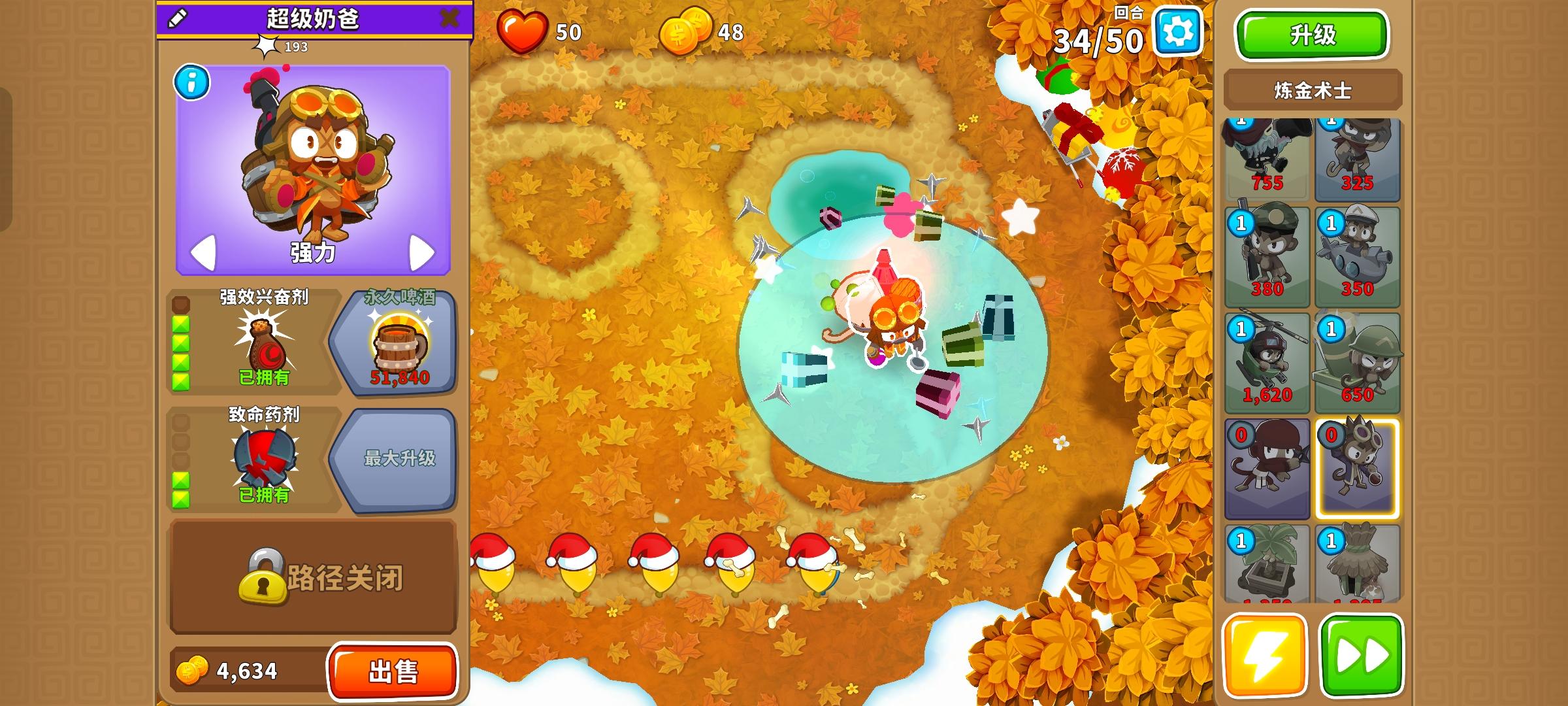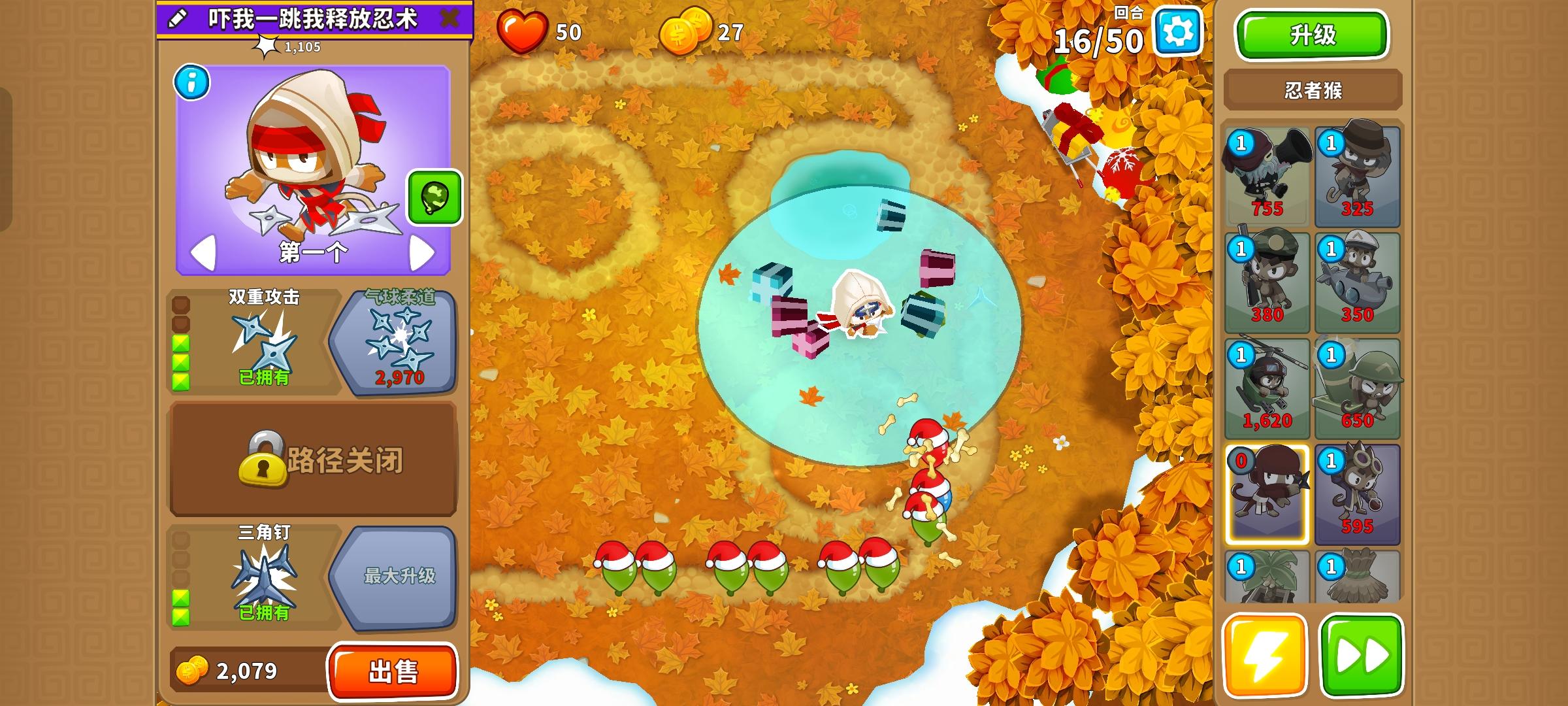 这次的困难征程又是前3岛很简单,但岛4和岛5开始上难度,因此仍然先介绍前3岛,岛4和5分开单独介绍!也不需要知识,力量和双金!只要带上英雄琼斯,亡命猴,狙击手猴,猴子潜艇,直升机飞行员,迫击炮猴,忍者猴,炼金术师,香蕉农场和猴子村就行。无需其他猴子!岛1:开局在图上位置放下100忍者猴,逐渐升到302,再来炼金术师辅助它,可直接升到420再升级忍者猴至402。最后在炼金术师范围内右侧补个230