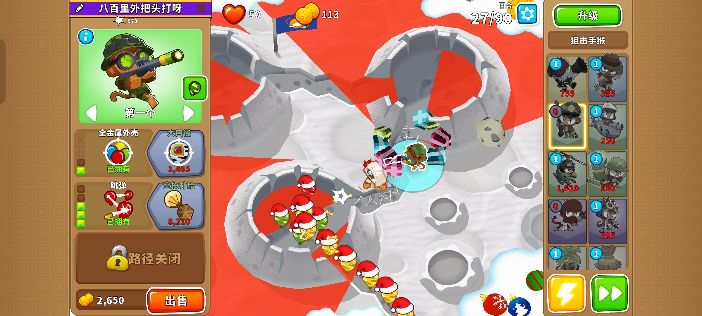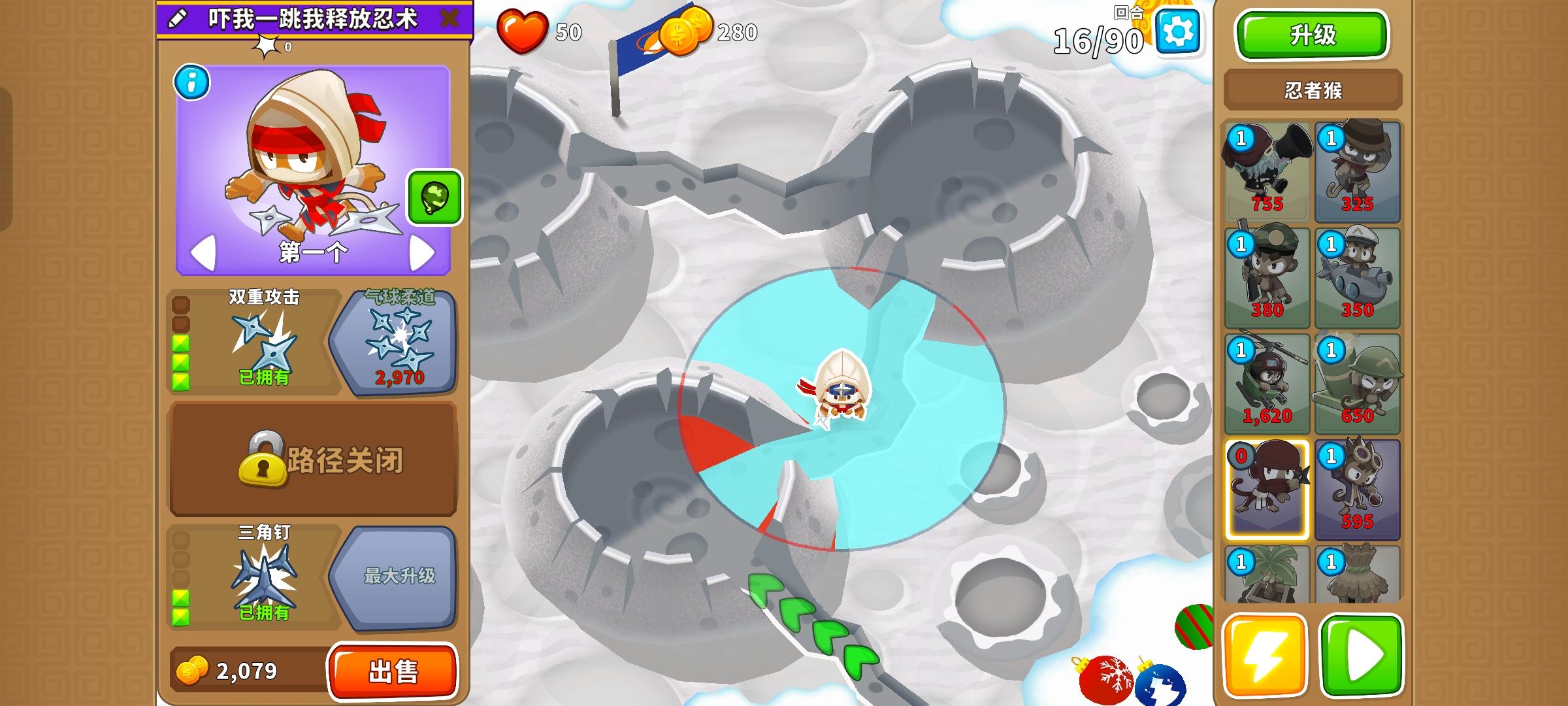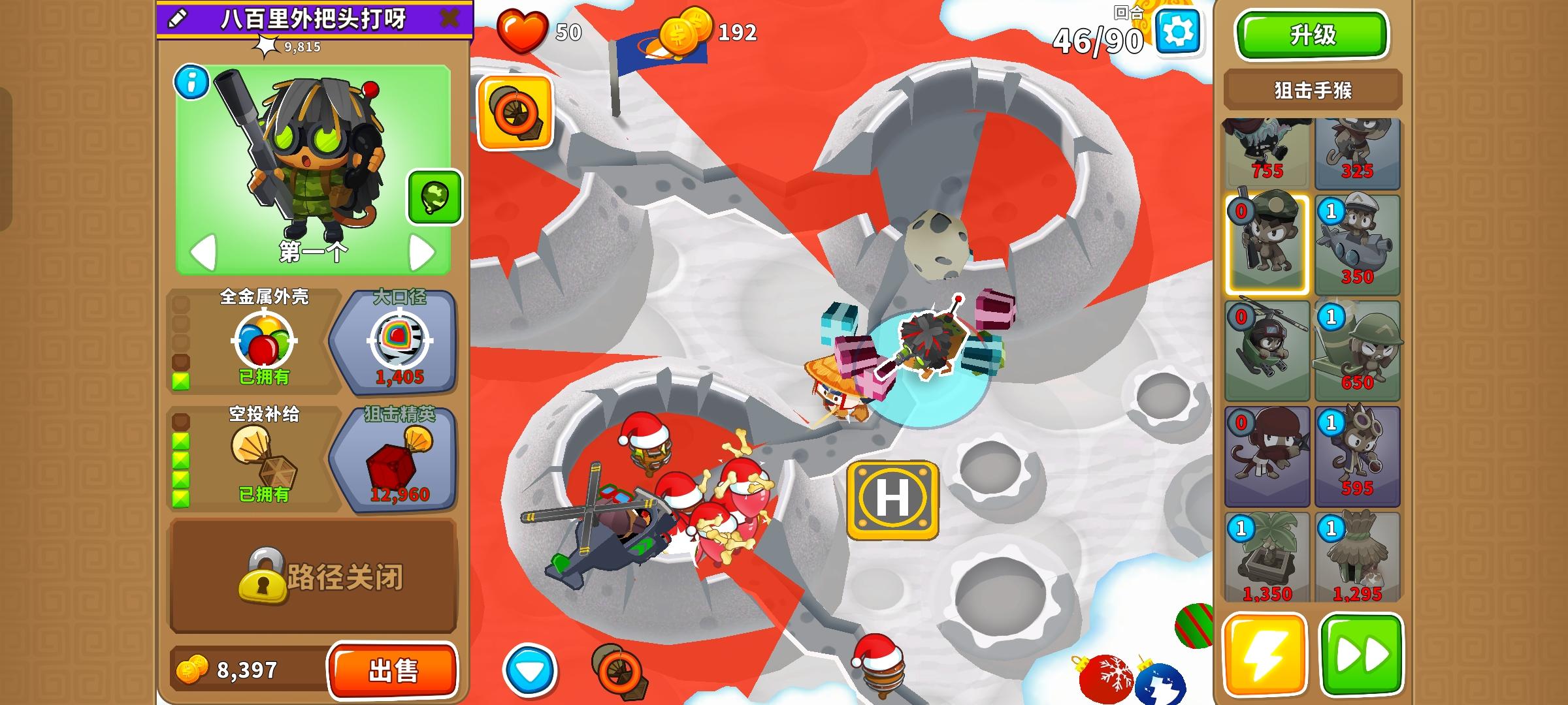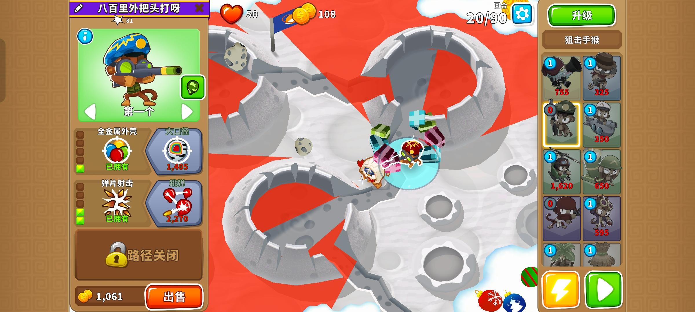 久等了,由于替代气球回合以及障碍限制,开始上难度,但并不太难。无需知识,力量和双金。开局在图上这个位置放下302忍者猴,钱够了在这里放下120狙击手猴,优先升到130,并把忍者猴升到402。之后来个003直升机飞行员,控死飞艇做到通过第40回合。然后优先升级140狙击手猴,有技能就用,也要升级直升机飞行员的上路两级,并放下420炼金术师辅助。之后就能放心获得250狙击手猴了,目标第一个。接着先放