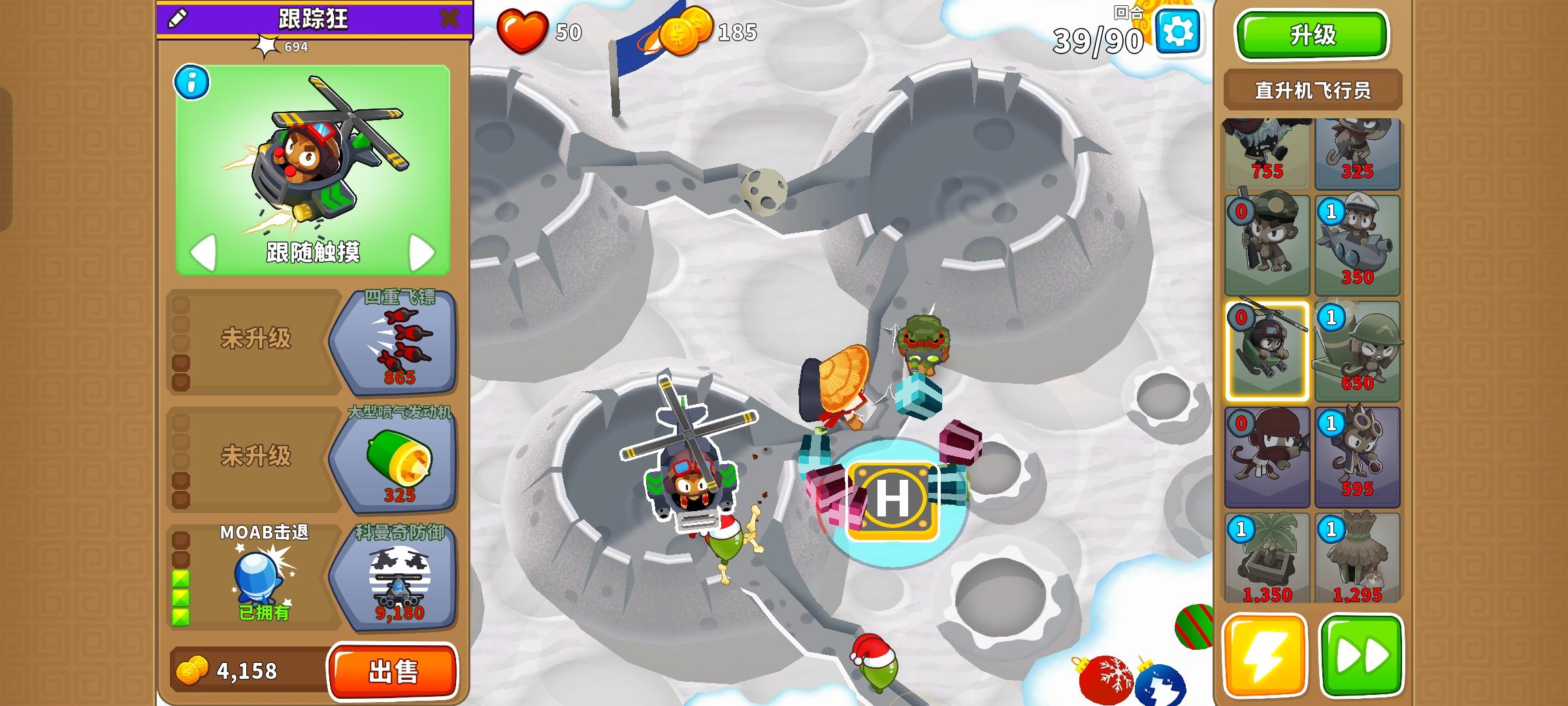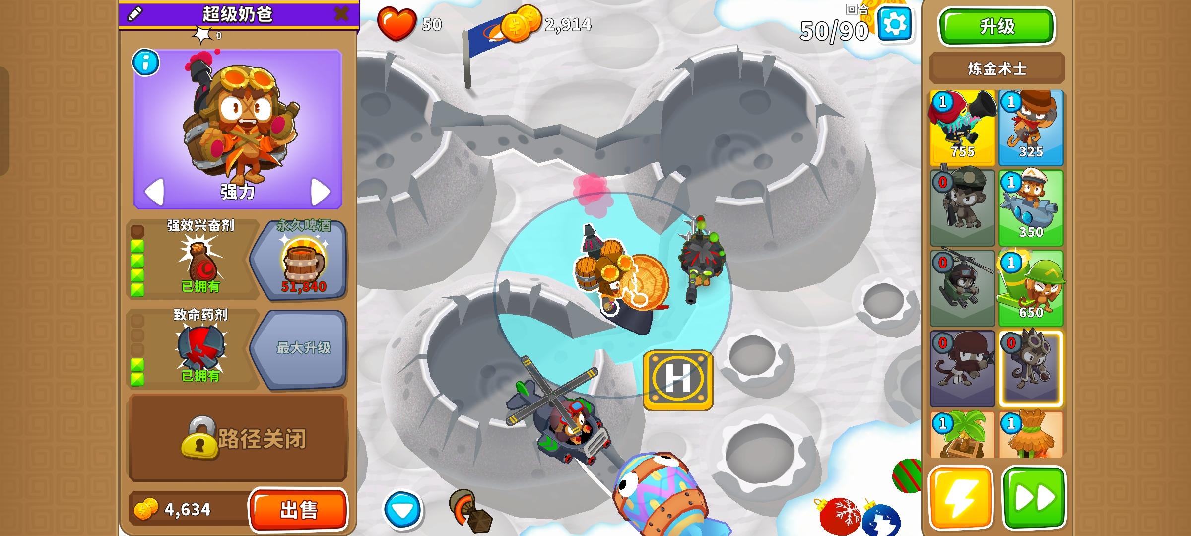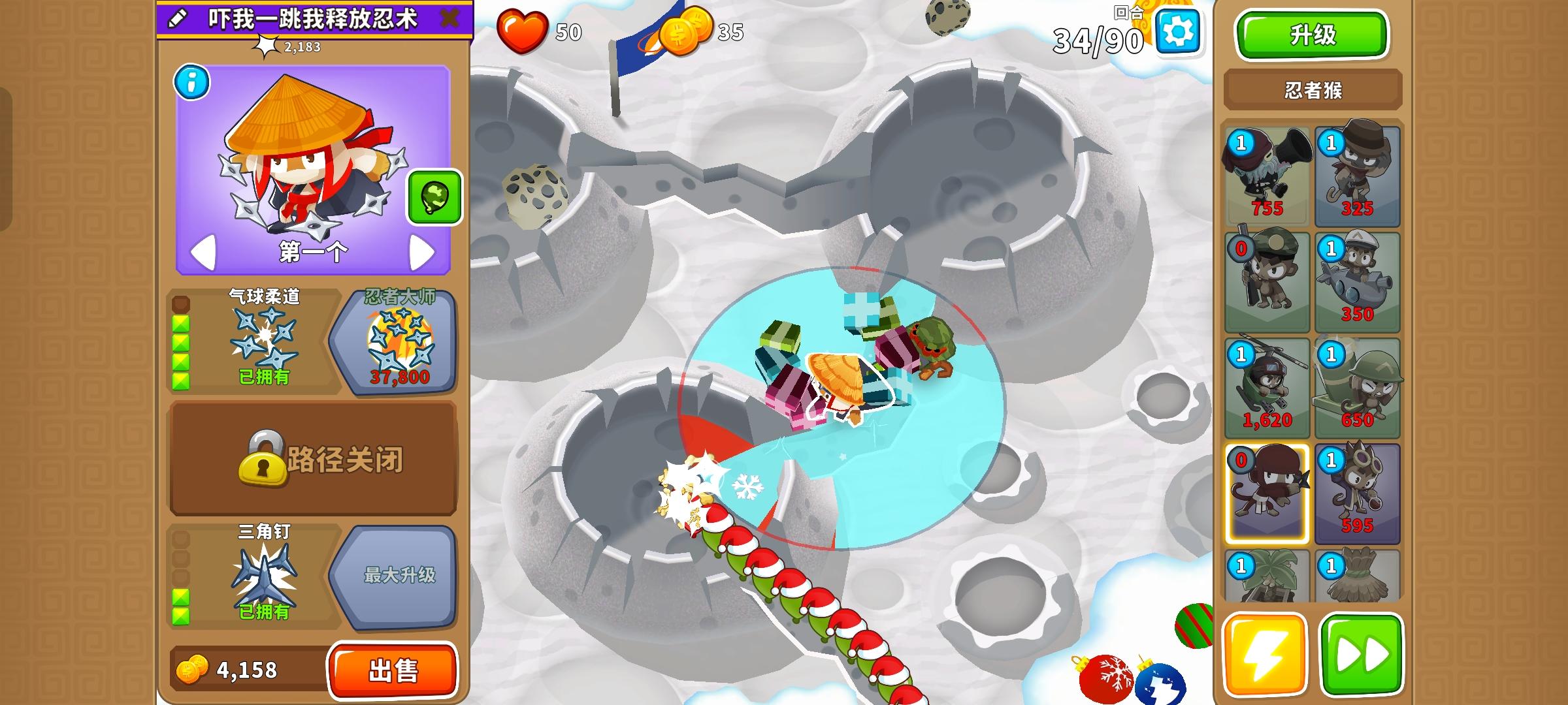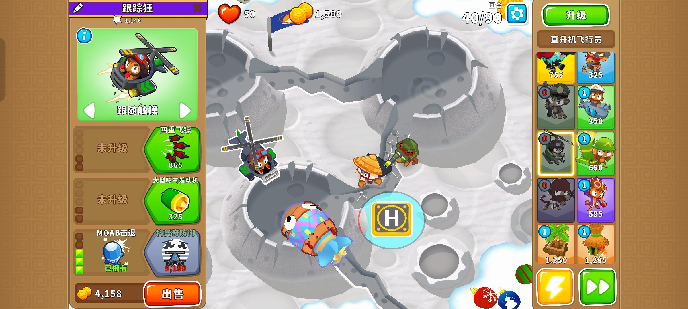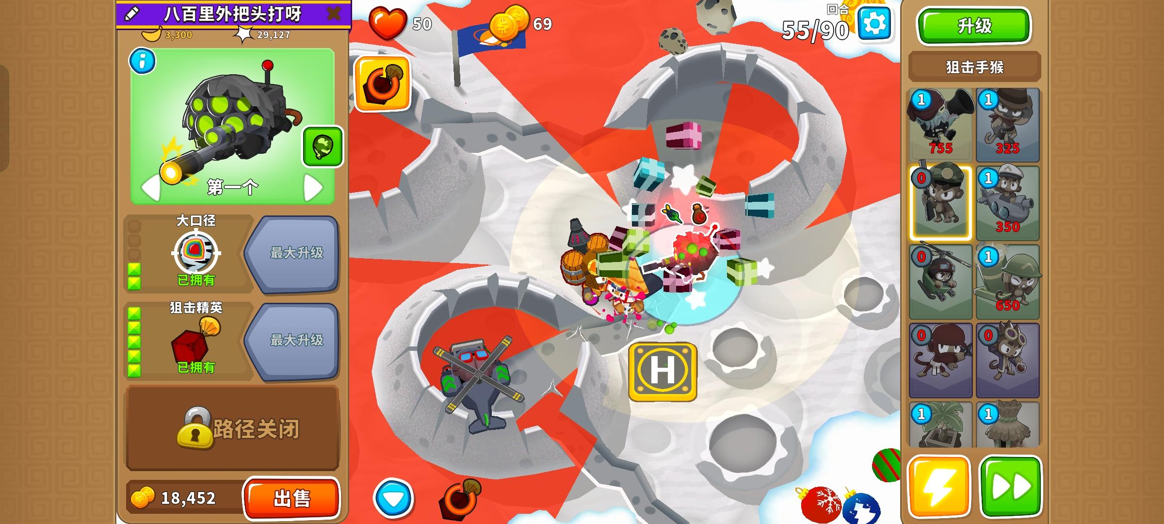 久等了,由于替代气球回合以及障碍限制,开始上难度,但并不太难。无需知识,力量和双金。开局在图上这个位置放下302忍者猴,钱够了在这里放下120狙击手猴,优先升到130,并把忍者猴升到402。之后来个003直升机飞行员,控死飞艇做到通过第40回合。然后优先升级140狙击手猴,有技能就用,也要升级直升机飞行员的上路两级,并放下420炼金术师辅助。之后就能放心获得250狙击手猴了,目标第一个。接着先放