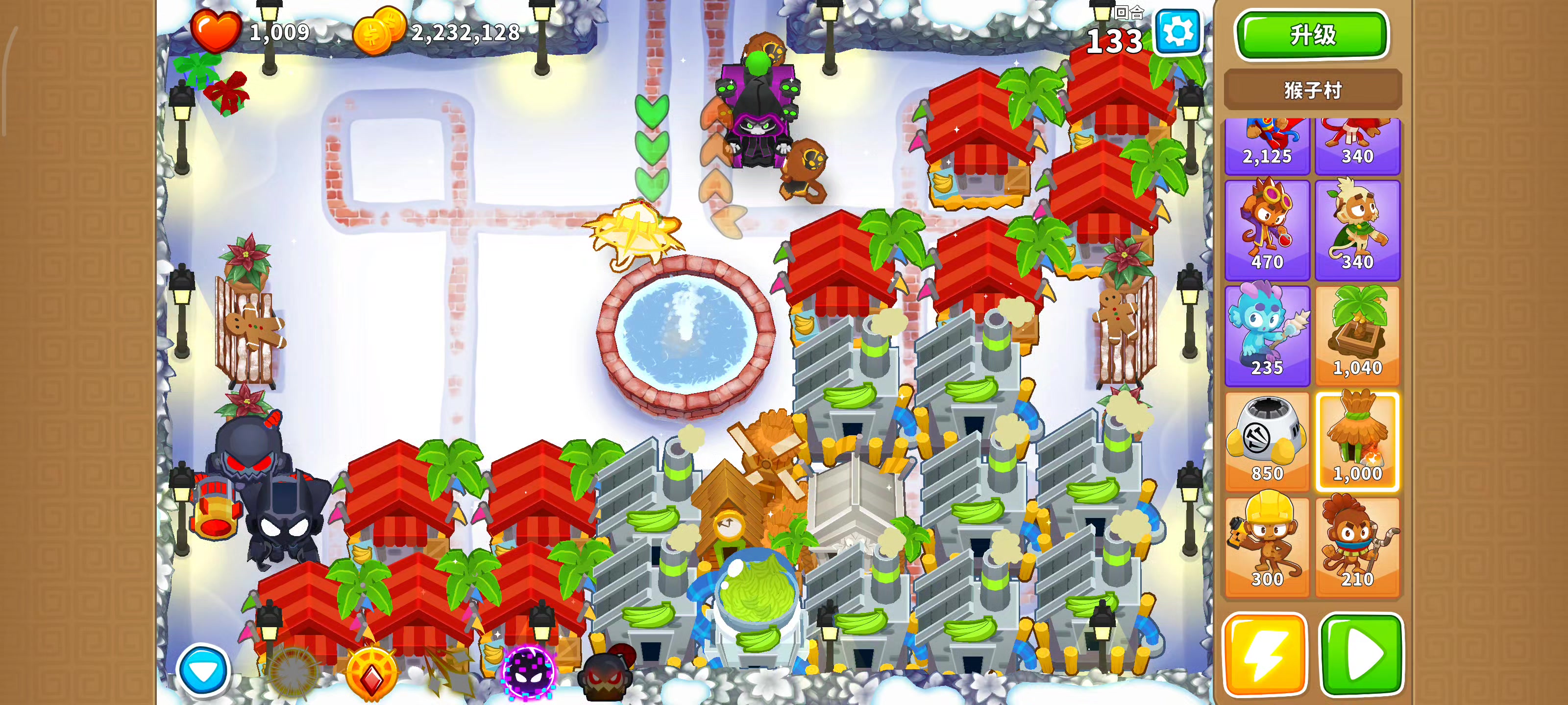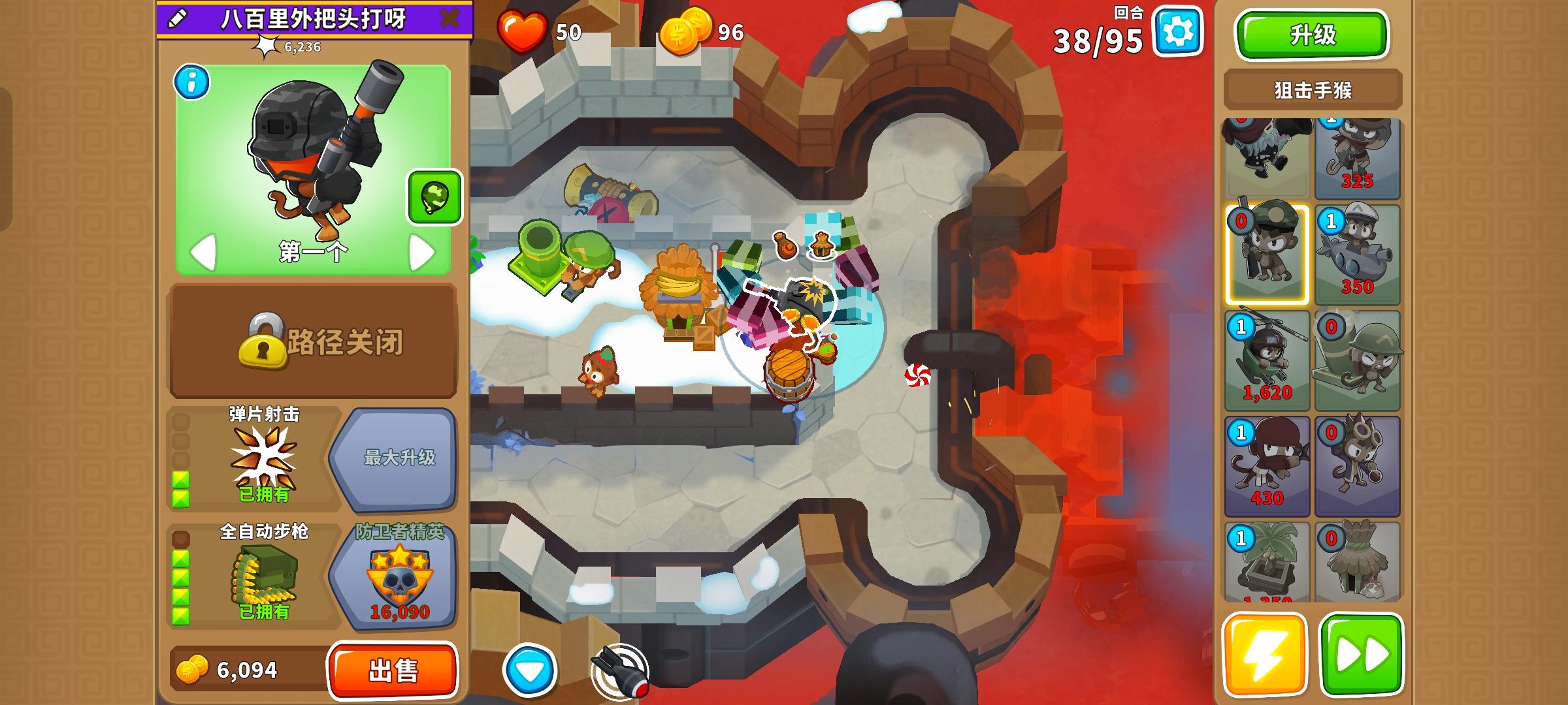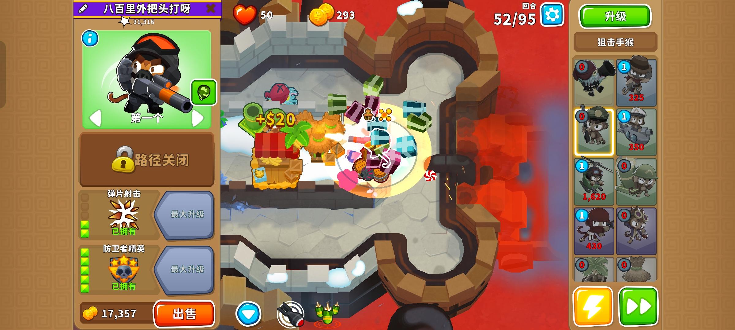 也是受猴友们启发去找精英充气机刷钱了因为是高级的八阶段充气机,为了保证战力上了之前刷钱拉的真太阳神,中路刺钉地毯顶掉一些复仇气球,还有一个缩小版国土防御。不过还是得不忘初心,剩下的位置刷了三个比较给力的加钱猴子(真能刷到加钱飞机还是挺惊喜的)。加上警长套装这套总共加钱40%,Boss战直接堆在一块,甚至连警长都不用上,迫击炮的落点也不用改,只需要不停点国土防御就能过了。还是不需要