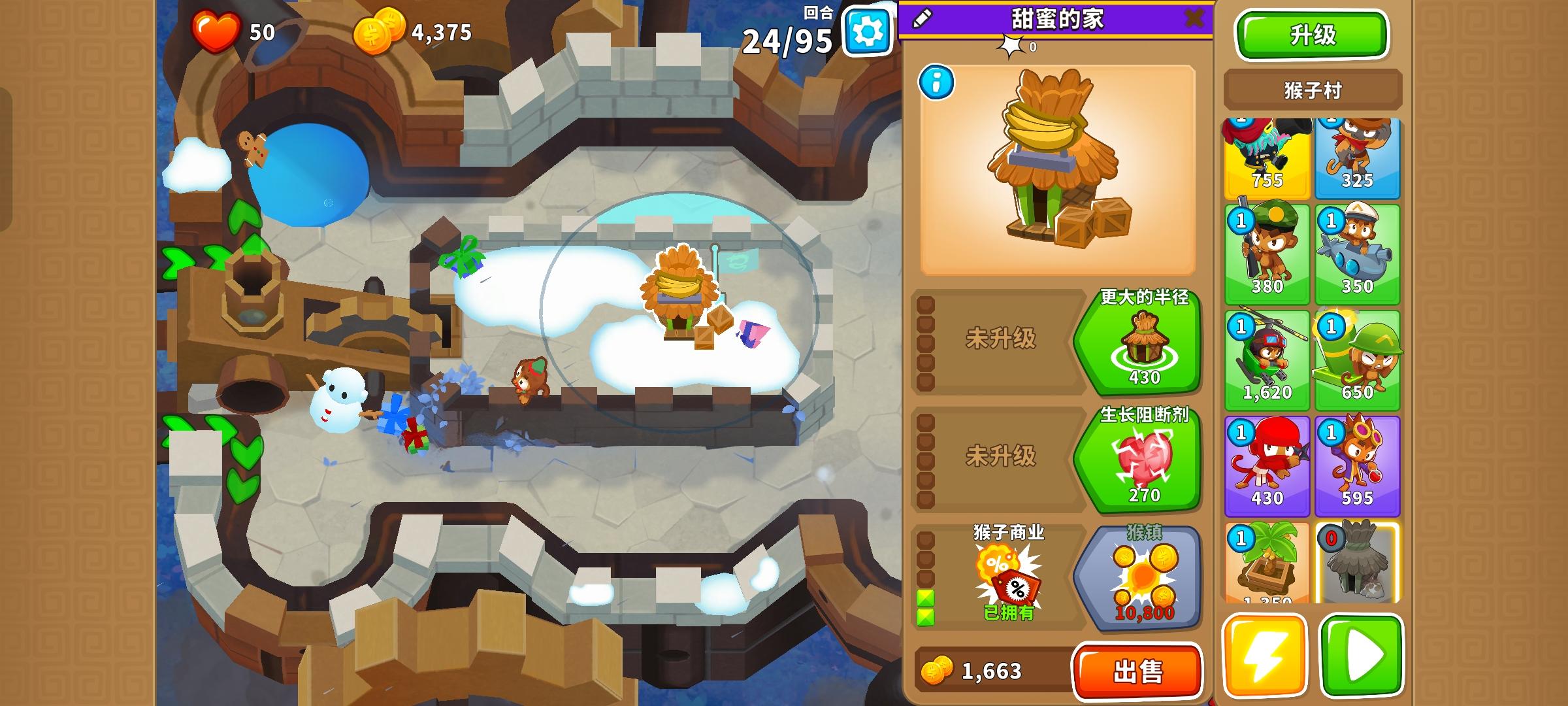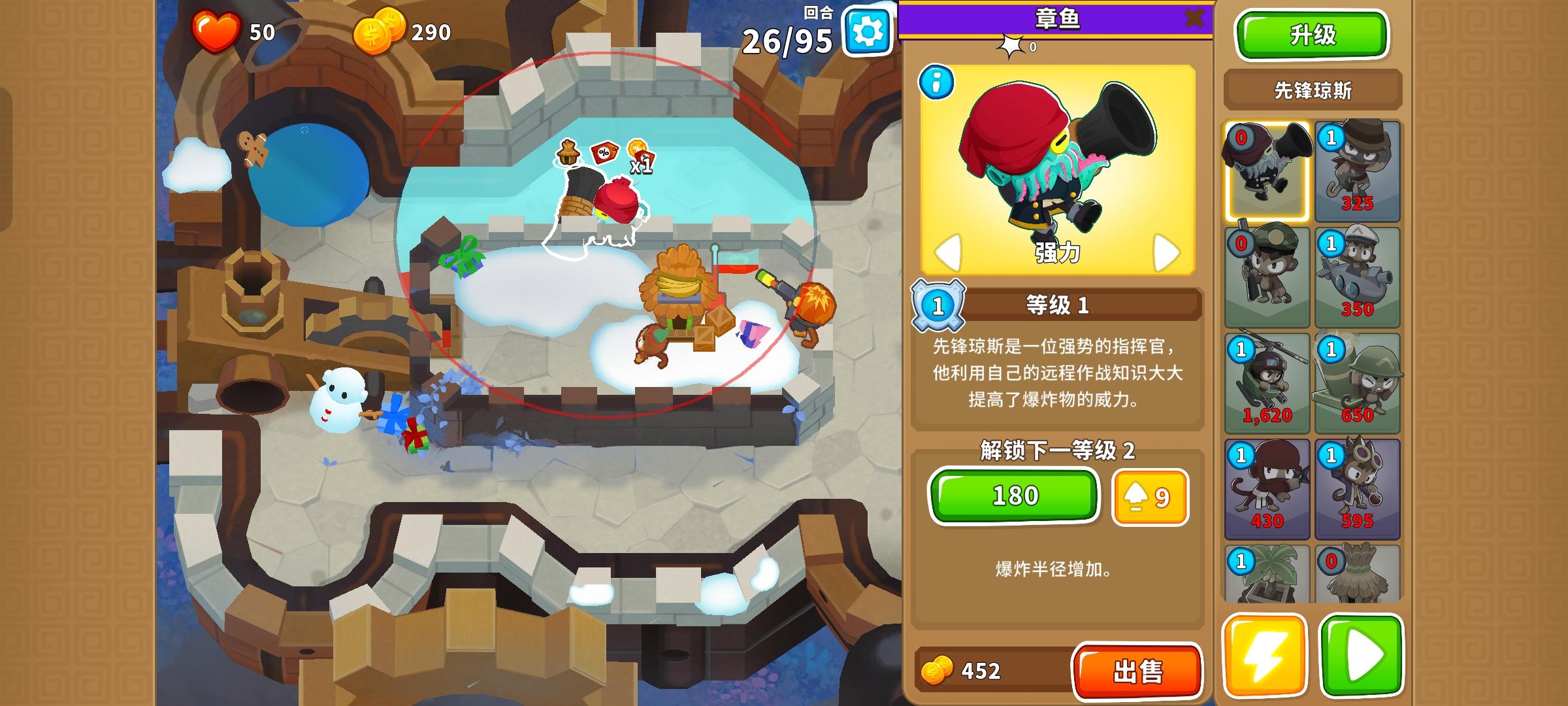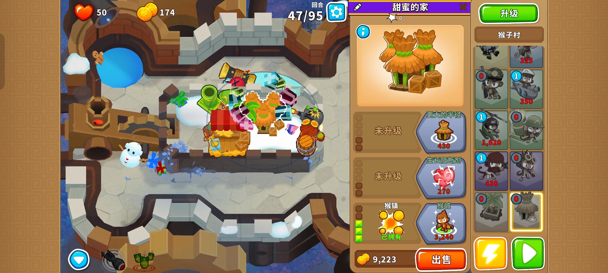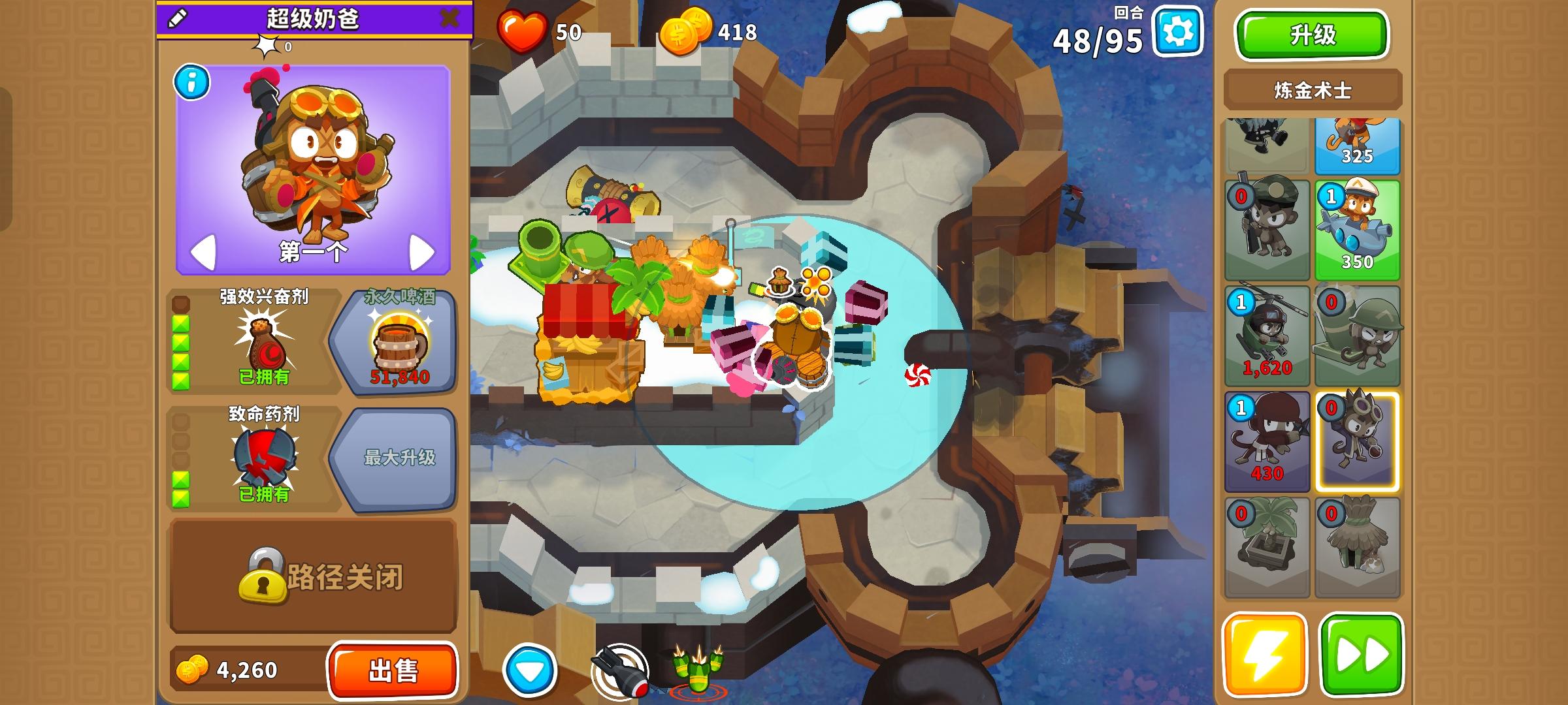 也是受猴友们启发去找精英充气机刷钱了因为是高级的八阶段充气机,为了保证战力上了之前刷钱拉的真太阳神,中路刺钉地毯顶掉一些复仇气球,还有一个缩小版国土防御。不过还是得不忘初心,剩下的位置刷了三个比较给力的加钱猴子(真能刷到加钱飞机还是挺惊喜的)。加上警长套装这套总共加钱40%,Boss战直接堆在一块,甚至连警长都不用上,迫击炮的落点也不用改,只需要不停点国土防御就能过了。还是不需要
