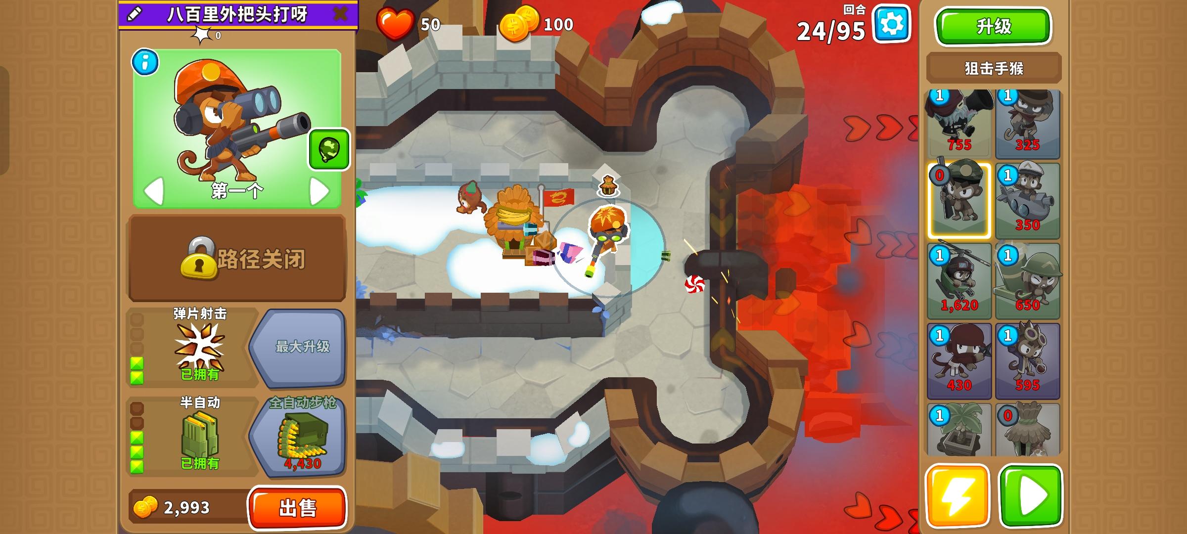 这关就比较难了,细节很重要,无需知识,力量和双金。开局先在图上位置放下002猴子村,并在范围内的最右边放下023狙击手猴。钱够了先在图上位置下英雄琼斯,目标强力;然后就是迫击炮猴,目标设在左下角的这里。他们都要在猴子村的范围之内。之后给狙击手猴来个专门的320炼金术师并将狙击手猴升到024,也需要先来个200香蕉农场赚钱,MOAB来时用英雄琼斯的震荡弹技能就行。之后把香蕉农场升到203,猴子