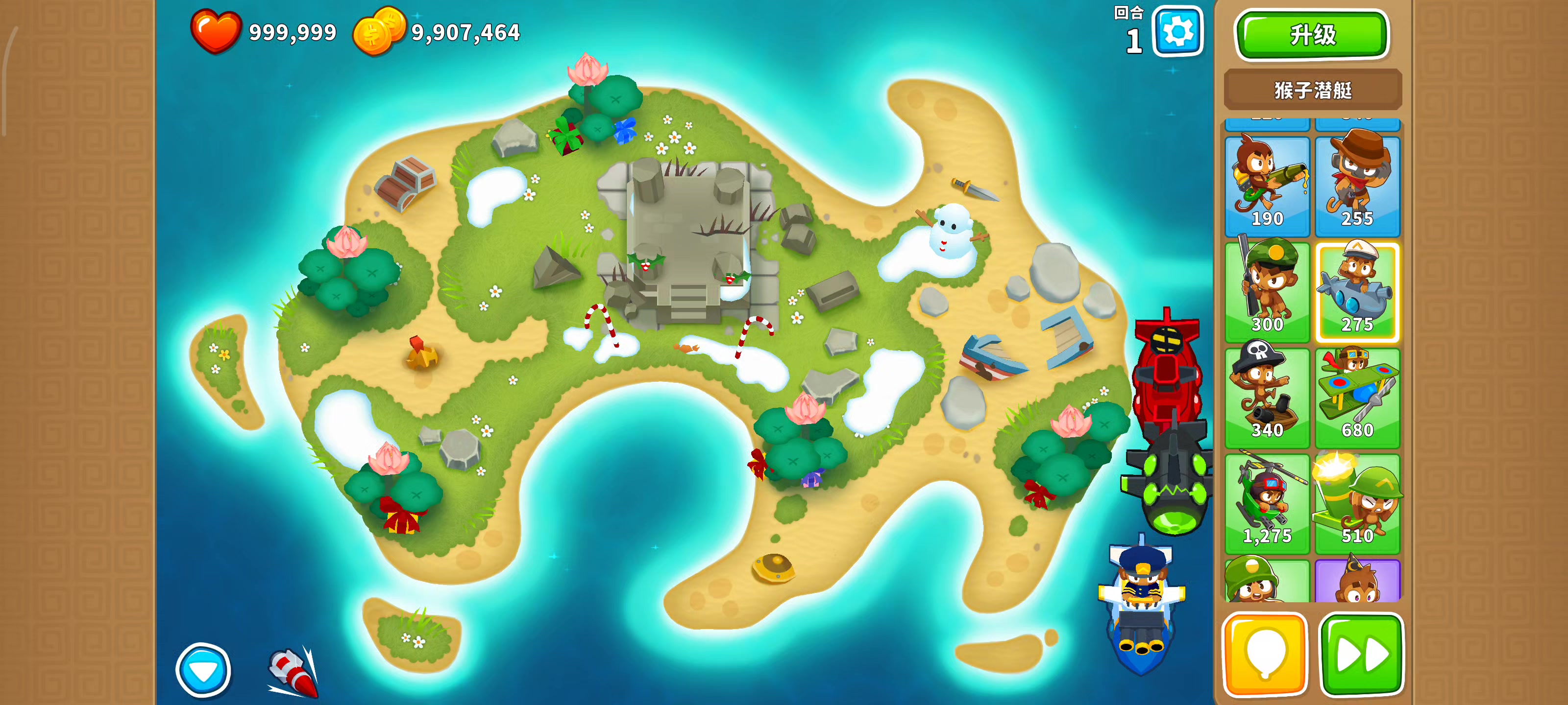 也是受猴友们启发去找精英充气机刷钱了因为是高级的八阶段充气机,为了保证战力上了之前刷钱拉的真太阳神,中路刺钉地毯顶掉一些复仇气球,还有一个缩小版国土防御。不过还是得不忘初心,剩下的位置刷了三个比较给力的加钱猴子(真能刷到加钱飞机还是挺惊喜的)。加上警长套装这套总共加钱40%,Boss战直接堆在一块,甚至连警长都不用上,迫击炮的落点也不用改,只需要不停点国土防御就能过了。还是不需要