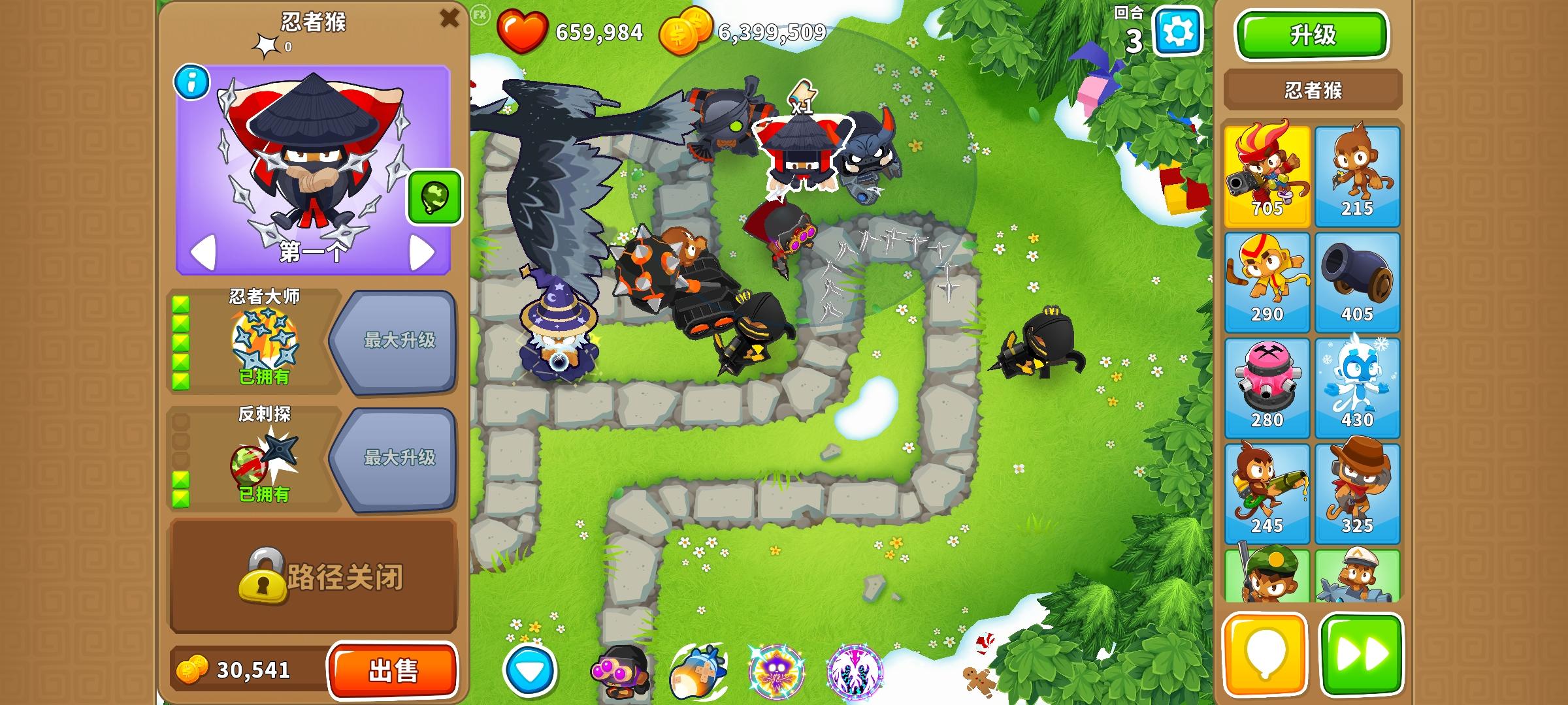 也是受猴友们启发去找精英充气机刷钱了因为是高级的八阶段充气机,为了保证战力上了之前刷钱拉的真太阳神,中路刺钉地毯顶掉一些复仇气球,还有一个缩小版国土防御。不过还是得不忘初心,剩下的位置刷了三个比较给力的加钱猴子(真能刷到加钱飞机还是挺惊喜的)。加上警长套装这套总共加钱40%,Boss战直接堆在一块,甚至连警长都不用上,迫击炮的落点也不用改,只需要不停点国土防御就能过了。还是不需要