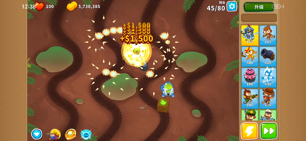 注意050海盗每次技能要拉到两个moab,要在前面的moab马上进家时释放,然后卖掉再买刷新技能cd。最后多一个moab用7级本杰明收尾。