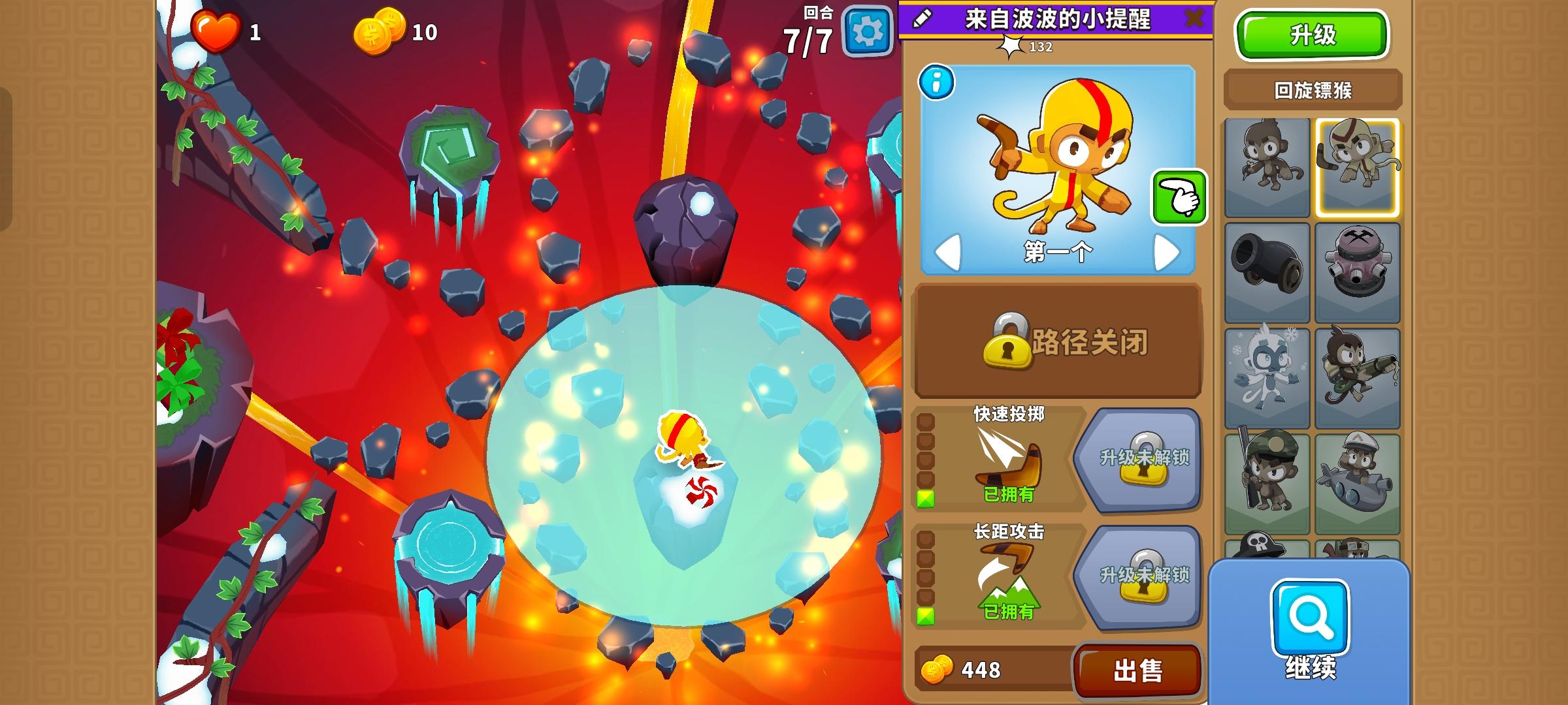 注意050海盗每次技能要拉到两个moab,要在前面的moab马上进家时释放,然后卖掉再买刷新技能cd。最后多一个moab用7级本杰明收尾。