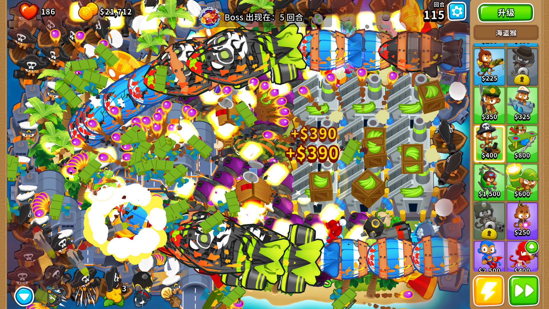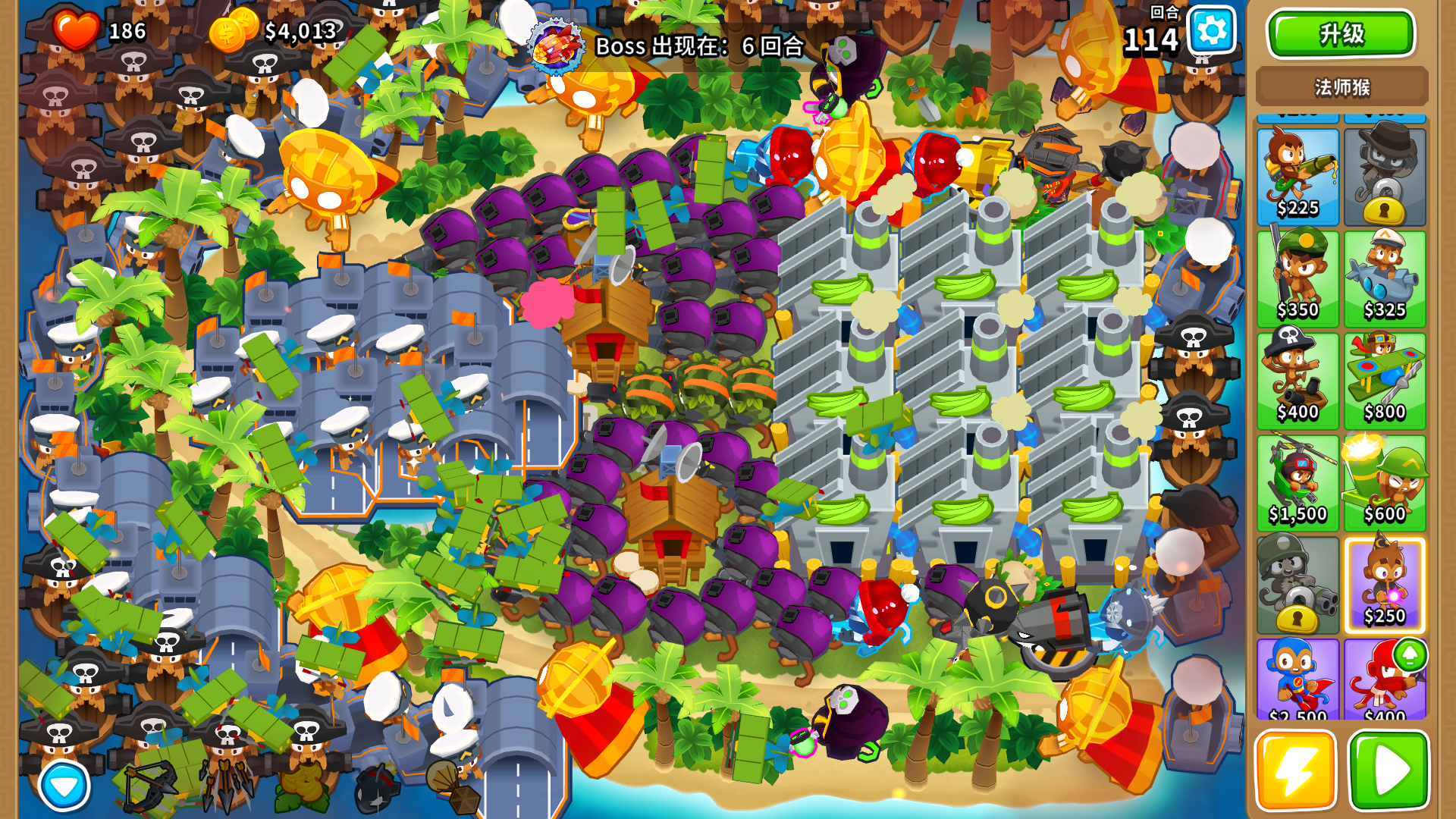 注意050海盗每次技能要拉到两个moab,要在前面的moab马上进家时释放,然后卖掉再买刷新技能cd。最后多一个moab用7级本杰明收尾。