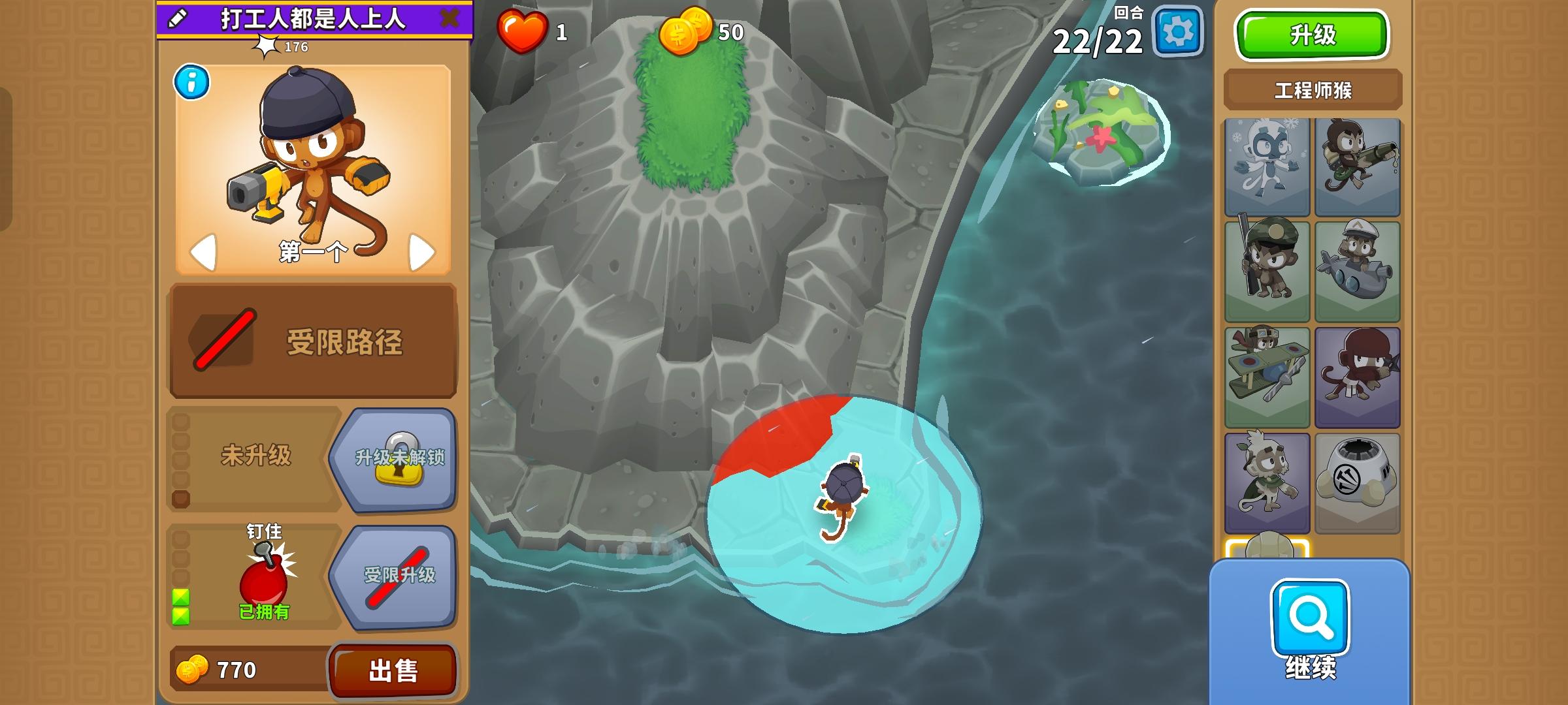 注意050海盗每次技能要拉到两个moab,要在前面的moab马上进家时释放,然后卖掉再买刷新技能cd。最后多一个moab用7级本杰明收尾。
